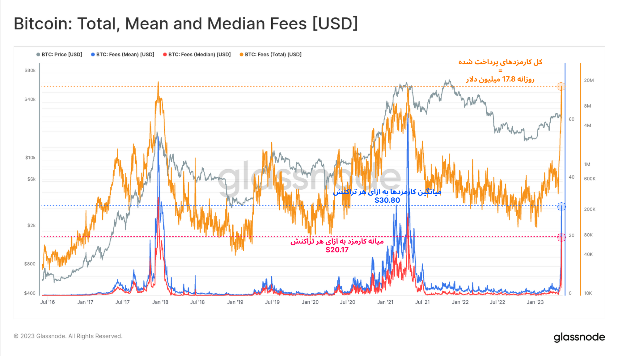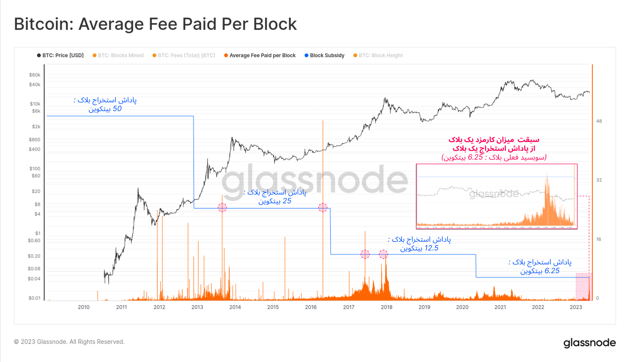در طول تاریخ شبکه بیتکوین، میانگین کارمزدهای شبکه تاکنون تنها پنج مرتبه از پاداش استخراج بلاک ( ۶.۵ بیتکوین) فراتر رفته است. آخرین مرتبه در اوج فعالیت کاربران در سال ۲۰۱۷ رخ داد. طبق سابقه نمودار این سبقت کارمزد تراکنشها کوتاهمدت است و پس از چند روز فروکش میکند.