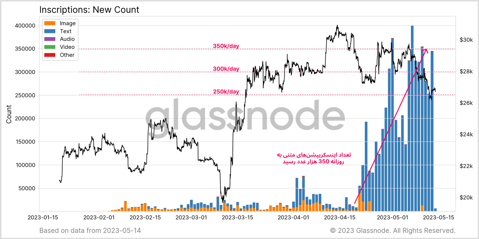 مینت inscriptionهای متنی در شبکه بیتکوین به حدی افزایش پیدا کرده است که تعداد فایلهای تصویری که در طول یک ماه اخیر مینت شده، در برابر آن محدود به نظر میرسد. در طول ماه می سال جاری، طی سه مرتبه بیش از ۳۵۰هزار inscription و طی هفته گذشته روزانه بیش از ۲۵۰هزار inscription در شبکه ثبت شده است.