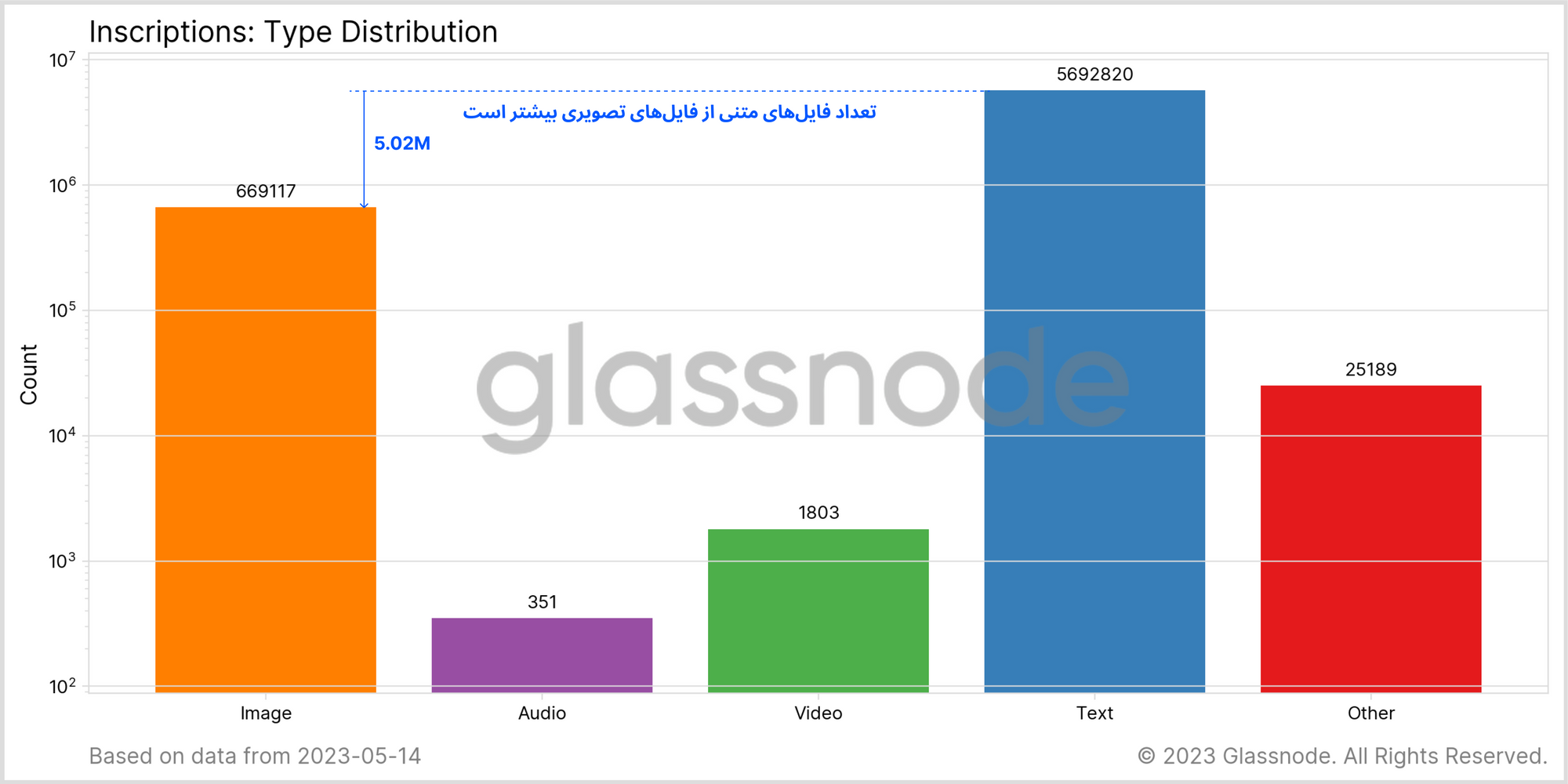 بنابراین بیش از ۵ میلیون inscription متنی در شبکه بیتکوین ثبت شده (معادل ۸۹ درصد تمام inscriptionها) و این فایلهای متنی به طور کامل سهم فایلهای تصویری را تحتالشعاع خود قرار داده است.