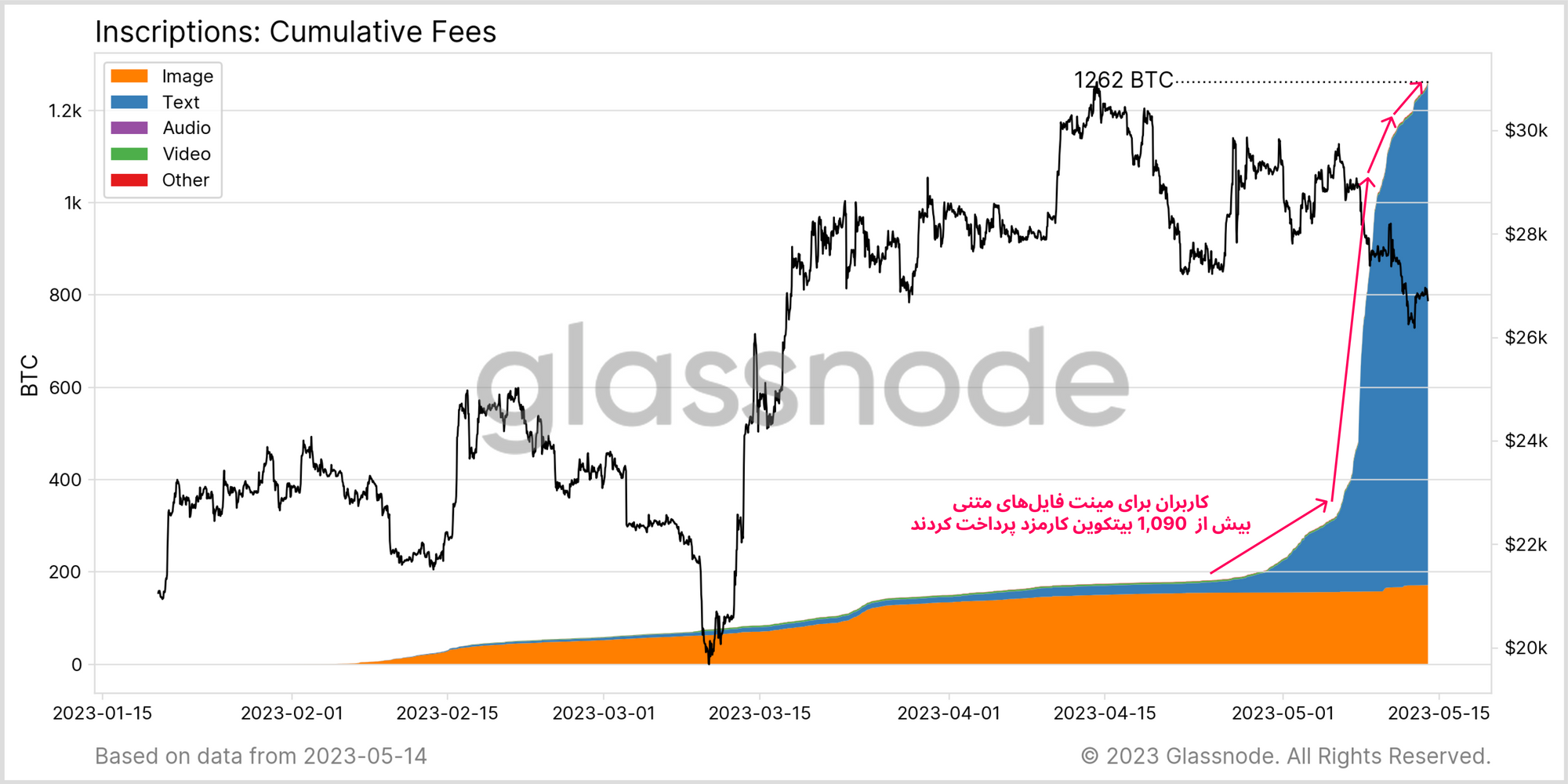 به طور کلی کاربران از طریق Inscriptionها مجموعا ۱,۲۶۲ بیتکوین به ماینرها کارمزد پرداخت کردند و ماینرها تنها طی هفته گذشته ۱,۰۹۰ بیتکوین (۸۶ درصد) دریافت کردهاند. در این نمودار مشاهده میکنید که Inscriptionهای متنی تا چه حد در افزایش کارمزدهای شبکه تاثیرگذار بودهاند.