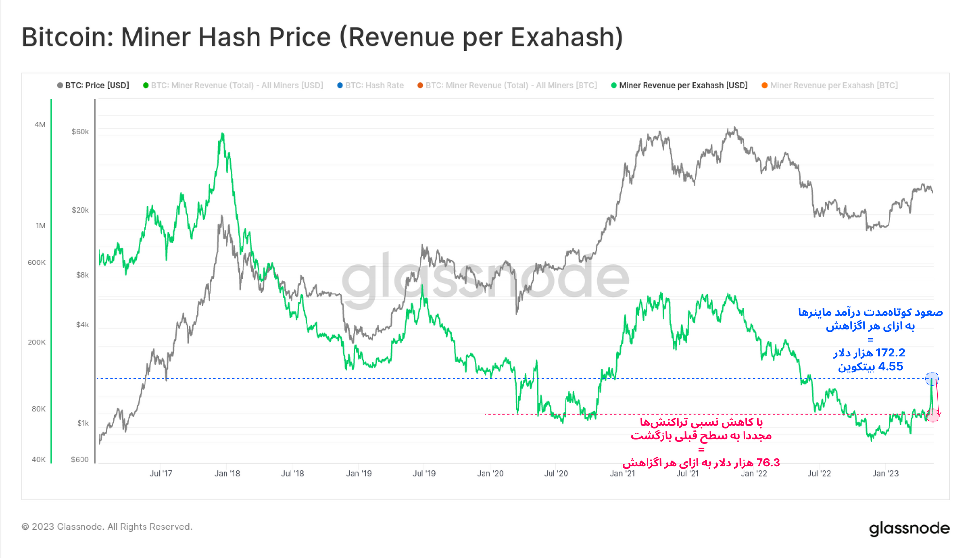 معیار Hash Price نشان میدهد که ماینرها به ازای هر اگزاهش چه میزان درآمد دلاری دارند. اکنون با استفاده از این معیار می توانیم تاثیرگذاری هیجانات اخیر شبکه را بر سطح درآمدی ماینرها مشاهده کنیم. این معیار در محاسبات خود، قیمت بیتکوین، میزان کارمزدهای شبکه و از طریق نرخ هشریت میزان رقابت ماینرها را برای استخراج هر بلاک در نظر میگیرد.