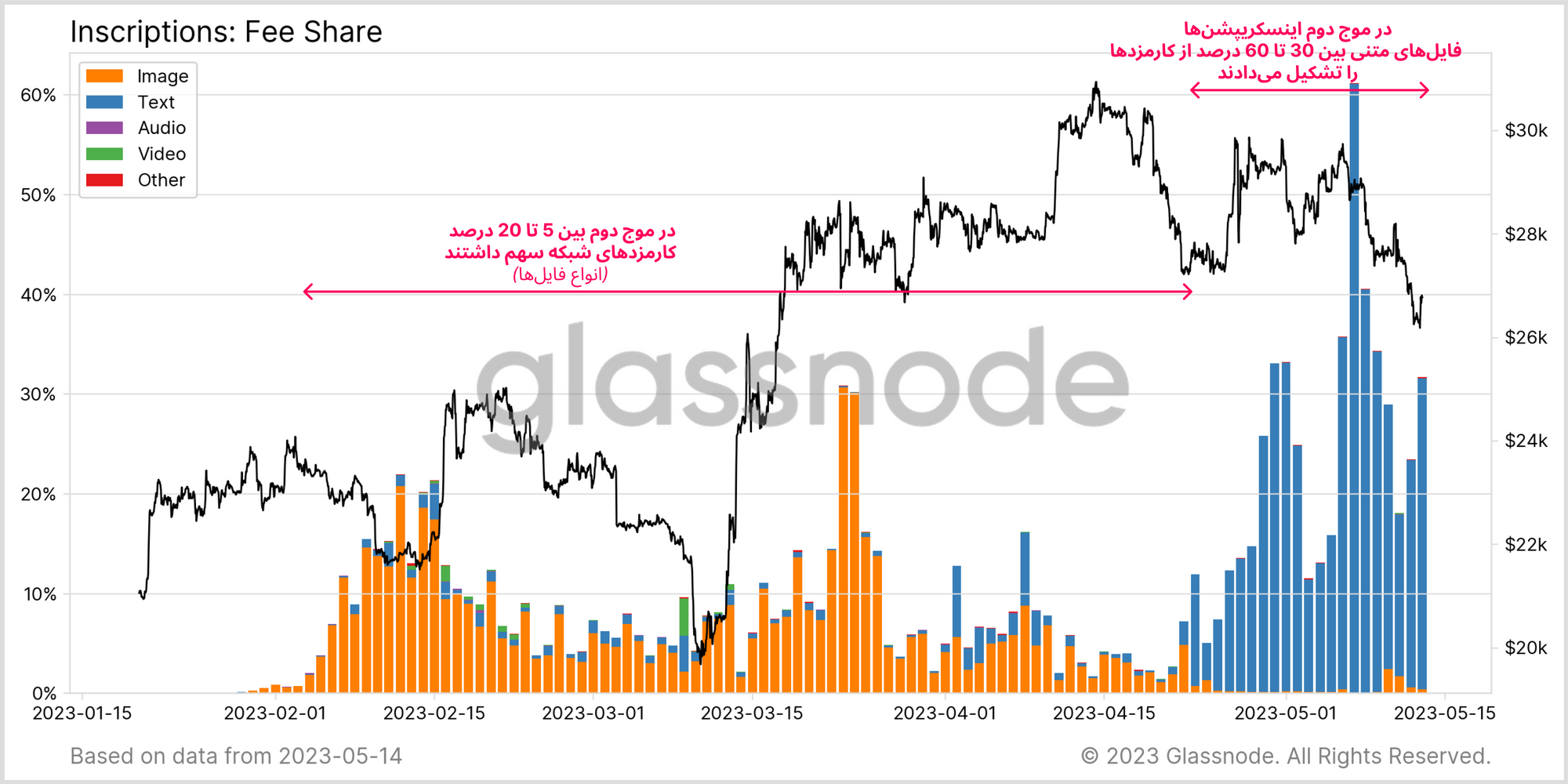 در موج دوم Inscriptionها حدود ۳۰ تا ۶۰ درصد کارمزدها برای فایلهای متنی پرداخت شد؛ در حالی که در موج اول سهم این نوع فایلها از کارمزدهای شبکه بین ۵ تا ۲۰ درصد بوده است.