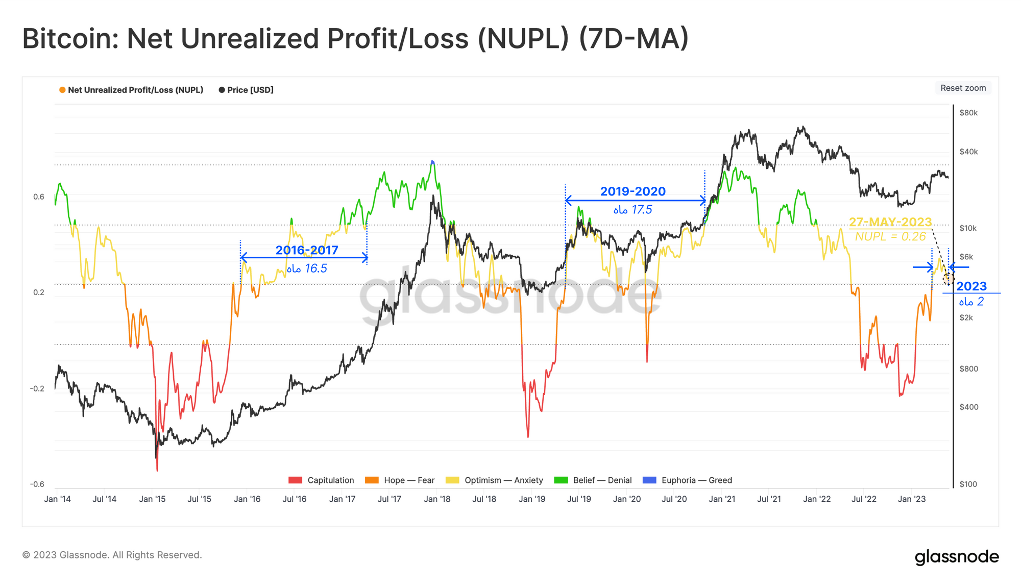 همانطور که مشاهده می کنید این معیار در حال حاضر در مرحله متعادل 🟡 خود قرار گرفته و به طور کلی ۳۷.۵ درصد روزهای معاملاتی را در این سطح گذرانده است. این معیار اخیرا در اوایل ماه مارس به این محدوده رسیده و در چرخههای قبل نیز حدود ۱۶ ماه را در این ناحیه متعادل گذرانده است.