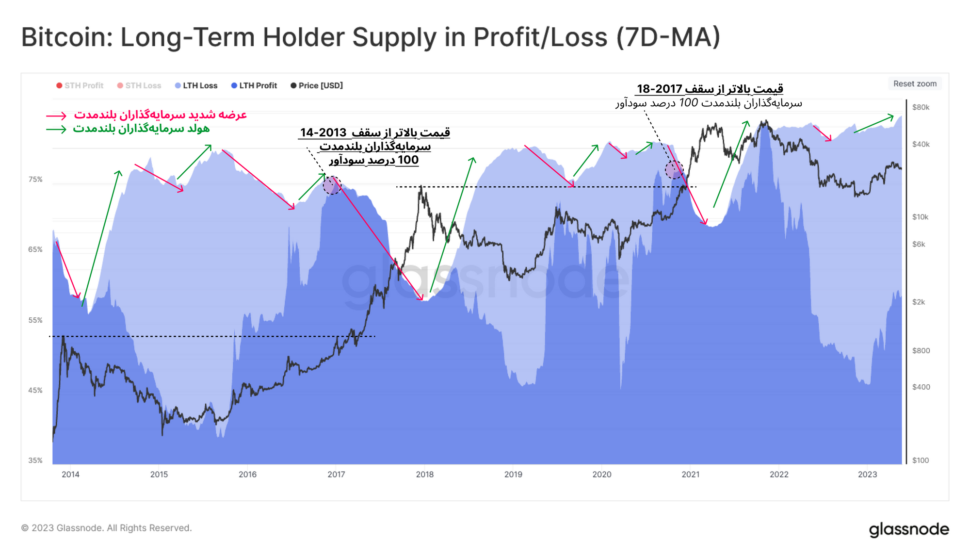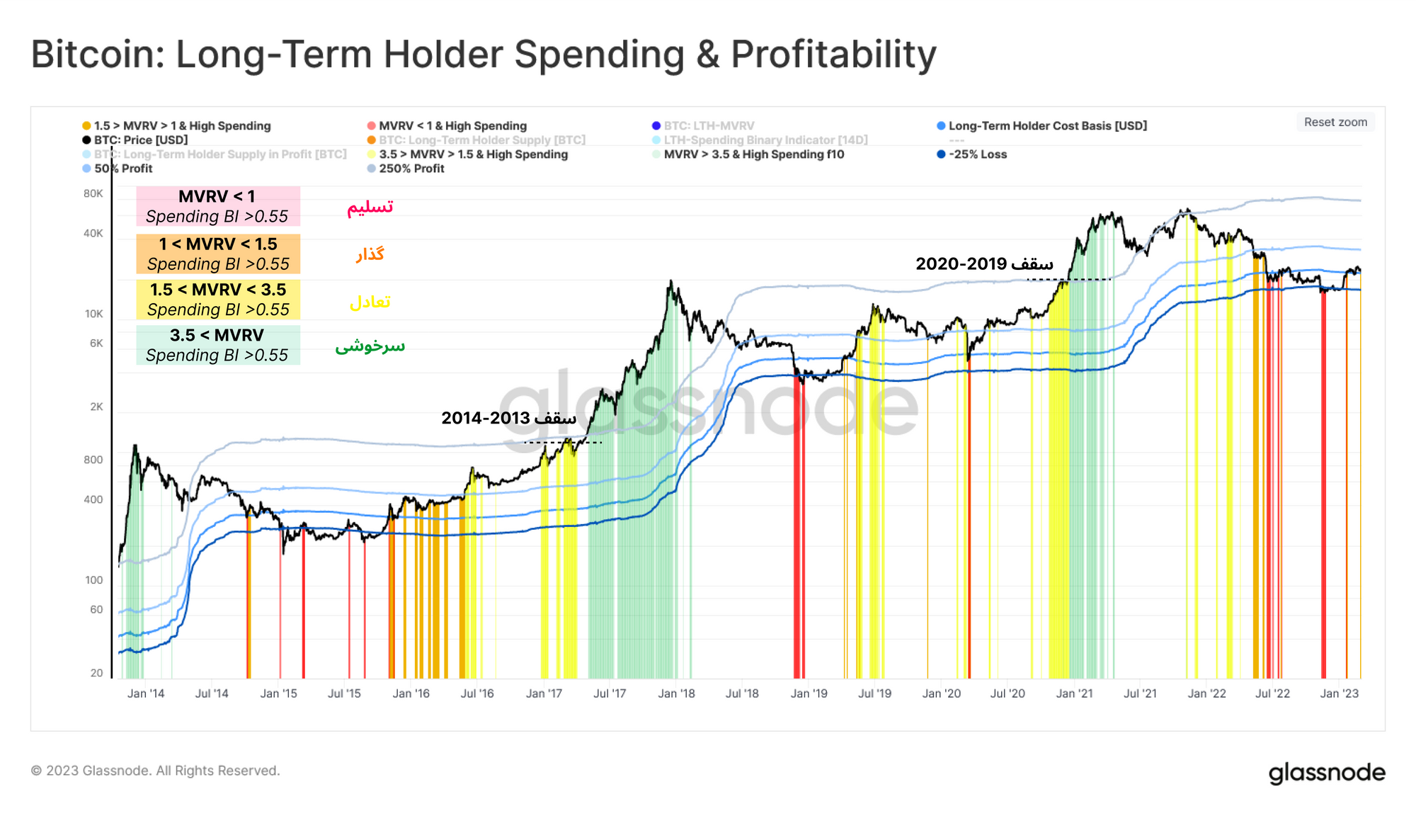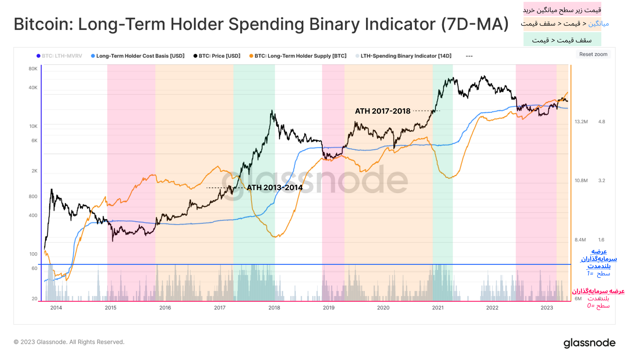 با توجه به شرایط فعلی، این سرمایهگذاران اخیراً به مرحله گذار 🟧 قدم گذاشتهاند و به صورت محدود به عرضه کوینهای خود پرداختند. به طور کلی بازار در هر جهتی به حرکت خود ادامه دهد، ما با استفاده از این ابزار میتوانیم از دیدگاه سرمایهگذاران بلندمدت، نواحی اشباع خرید و فروش بازار را شناسایی کنیم.