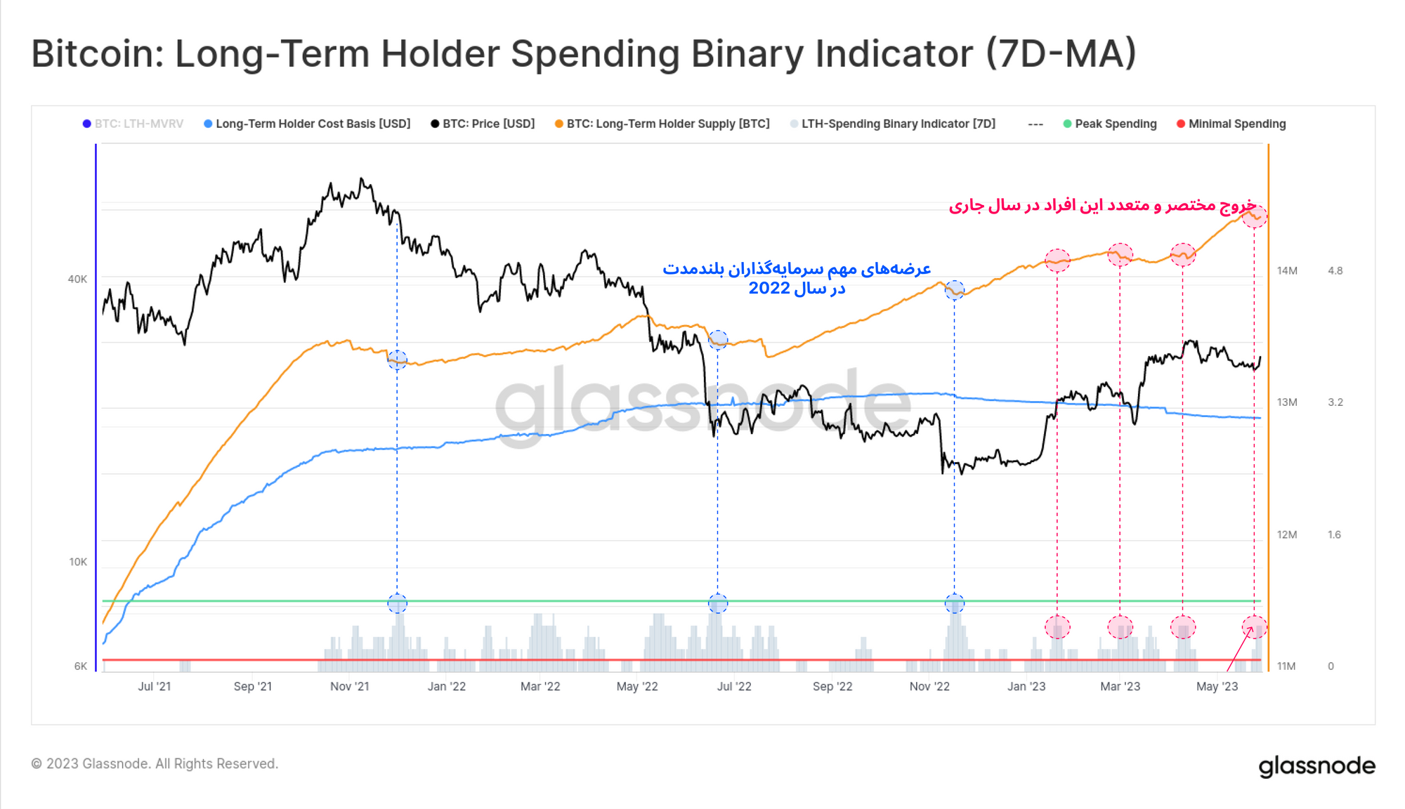 در قدم اول به میزان موجودی سرمایهگذاران بلندمدت توجه داریم. همانطور که مشاهده میکنید، موجودی سرمایهگذاران بلندمدت مطابق با چرخههای مختلف دچار تغییر میشود. طبق نمودار این سرمایهگذاران در مواقعی به هولد سرسختانه دارایی خود پرداخته 🟢 و در مواقع دیگر به شدت دارایی خود را عرضه 🔴 میکنند.