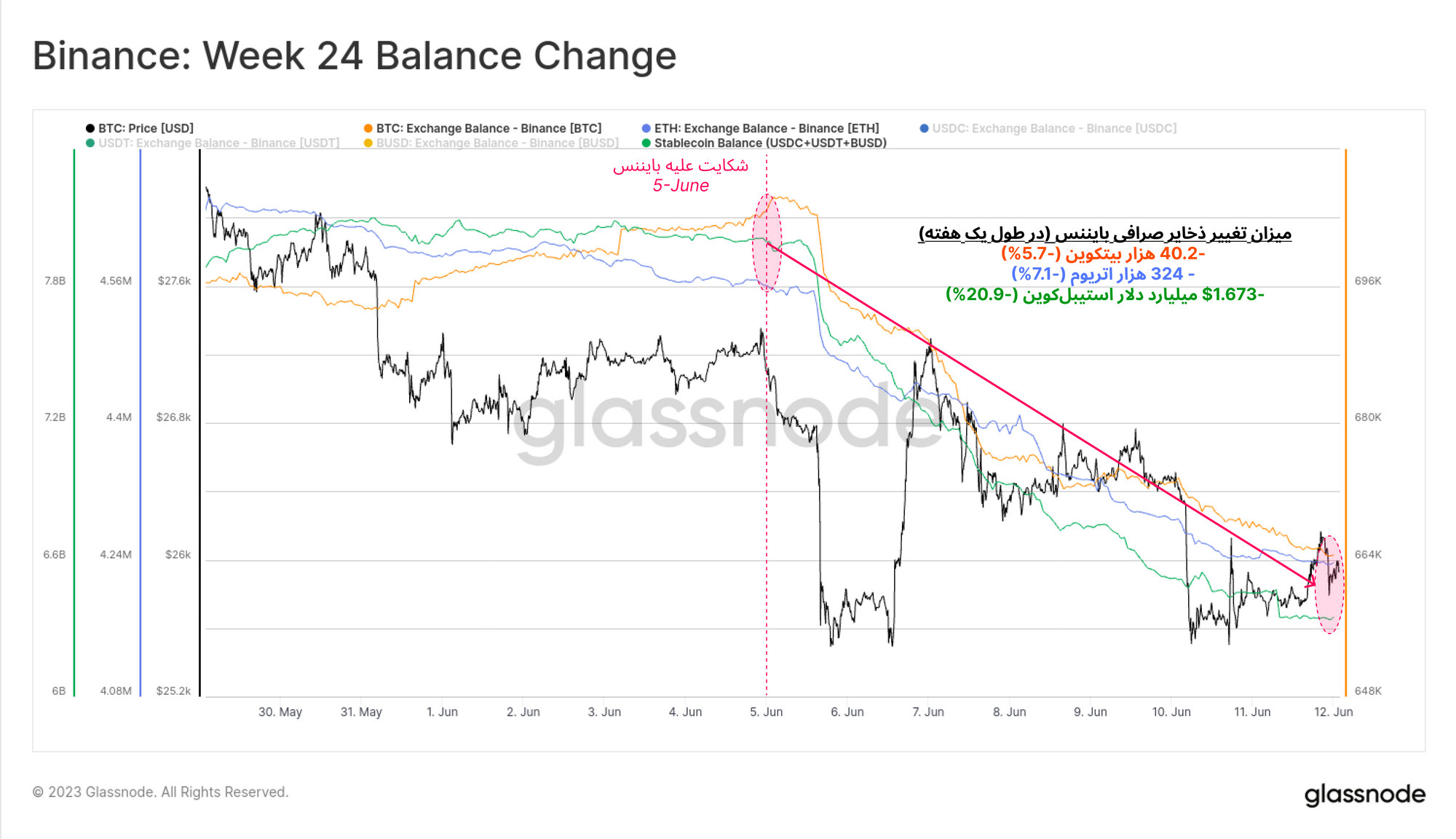 طی هفتهی اخیر سرمایهگذاران به صورت مستمر دارایی خود را از Binance خارج کردند؛ به طوری که حدود ۱.۶ میلیارد دلار از ذخایر استیبل کوینها، معادل ۲۰.۹٪ از کل موجودی این صرافی کاهش یافت. البته ذخایر بیتکوین و اتریوم این صرافی هر کدام به ترتیب با کاهش ۵.۷٪ و ۷.۱٪، نسبتاً ریزش کمتری را تجربه کردند.