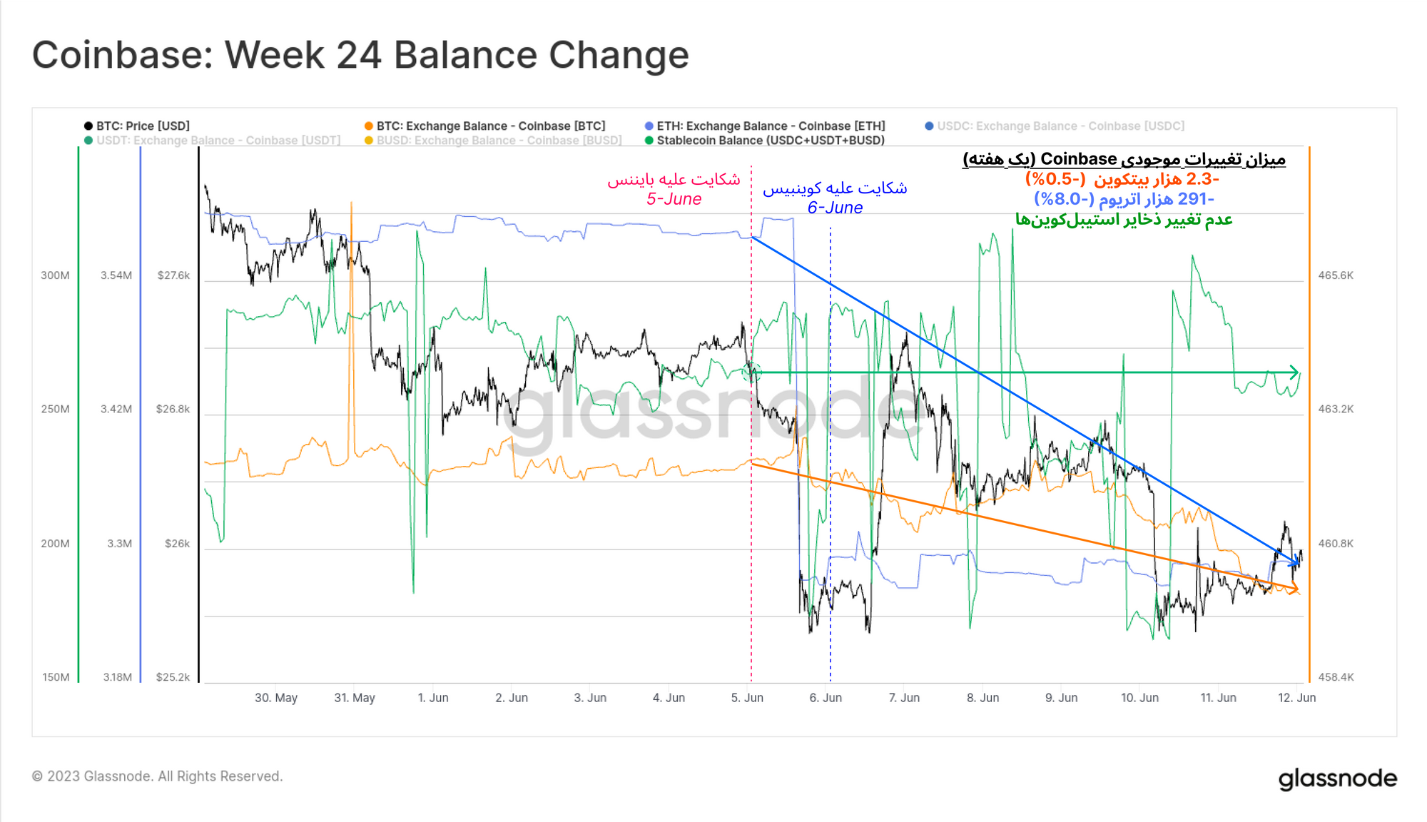 سازمان SEC آمریکا، با اعلام شکایات بسیار سنگین خود علیه Binance و Coinbase آشکارا به جنگ با بازار ارزهای دیجیتال میشتابد. در پی این اقدامات، به دلیل نگرانی برخی از کاربران، ذخایر این دو صرافی طی هفته گذشته با کاهش مواجه شد. به استثنای ذخایر استیبلکوین Binance ،جریان ورودی و خروجی این دو صرافی چندان غیرعادی نبود. اکنون باید دید که سرمایهگذاران در هفتههای آتی به نتایج این شکایات چه واکنشی نشان خواهند داد.