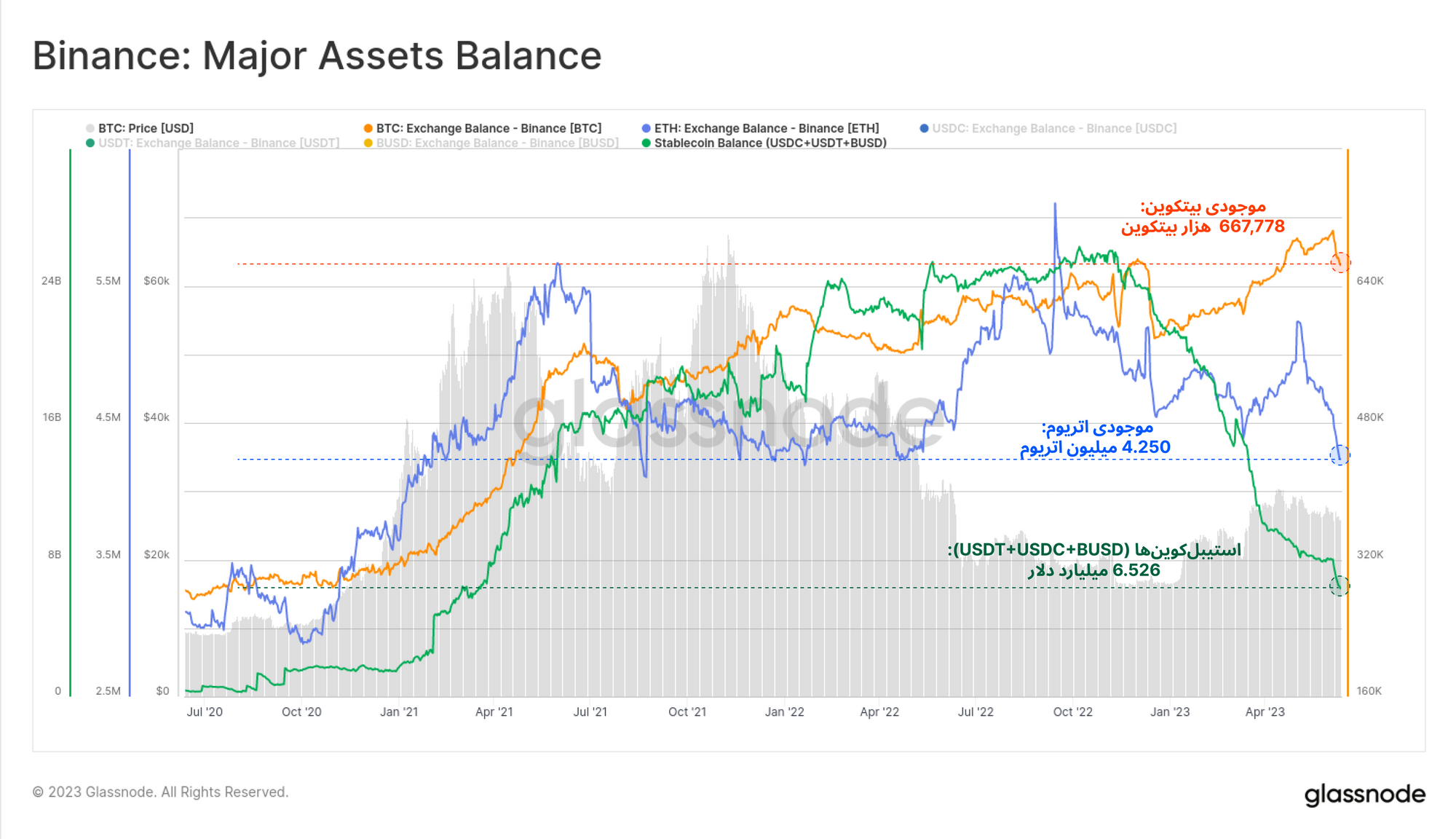 علیرغم اینکه جریان خروجی قابلتوجهی از Binance مشاهده کردیم، با این حال باید توجه داشته باشیم که این صرافی بزرگترین ذخایر موجود را در اختیار دارد و ذخایر بیتکوین و اتریوم آن همچنان قابلتوجه هستند. البته ذخایر استیبلکوین این صرافی از نوامبر ۲۰۲۲ با ارزش ۲۶میلیارد دلار تا کنون به ارزش ۶.۵ میلیارد دلار رسیده است.
