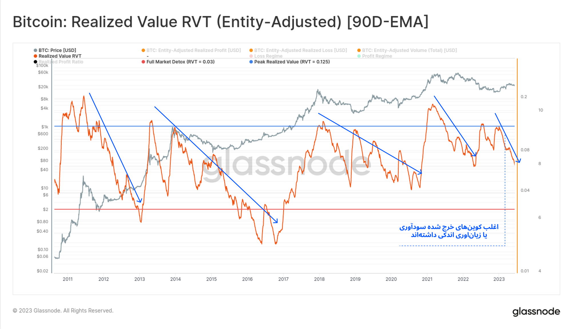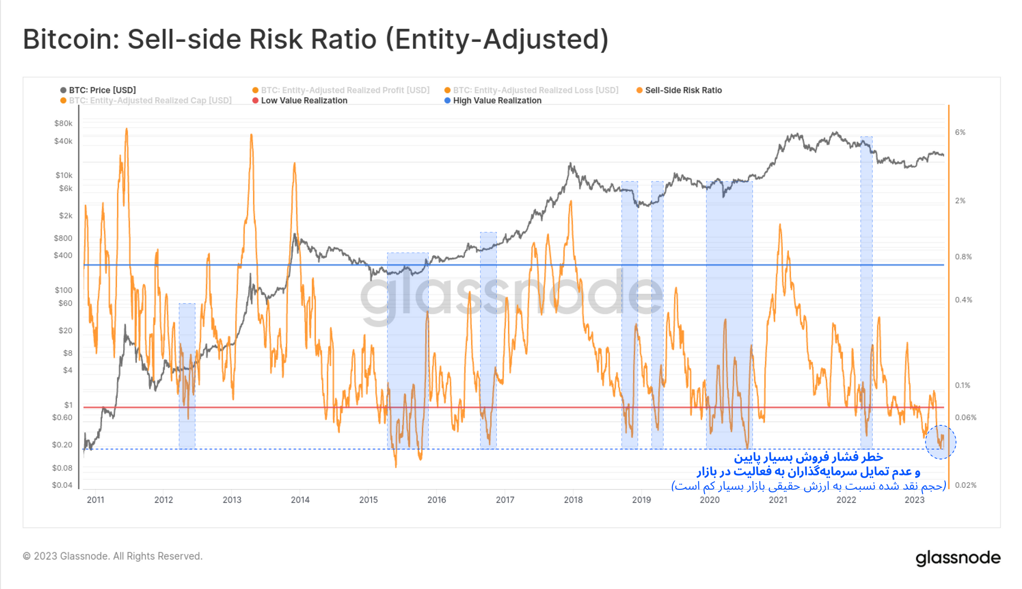 نمودار زیر حجم سود و زیان نقد شده را نسبت به ارزش حقیقی بازار بیتکوین در نظر میگیرد و از این طریق احتمال فشار فروش را میسنجد. از آنجایی که حجم سود و زیان نقد شده در هفته اخیر به پایینترین نواحی رسیده، خطر فشار فروش بسیار اندک است. زیرا حجم سود و زیانی که در حال حاضر در بازار نقد میشود نسبت به ارزش حقیقی فعلی بازار ( معادل ۳۹۱ میلیارد دلار) بسیار اندک است. معمولاً زمانی که افراد تمایل و انگیزهای برای ادامه فعالیت ندارند، خطر فشار فروش بسیار پایین است.