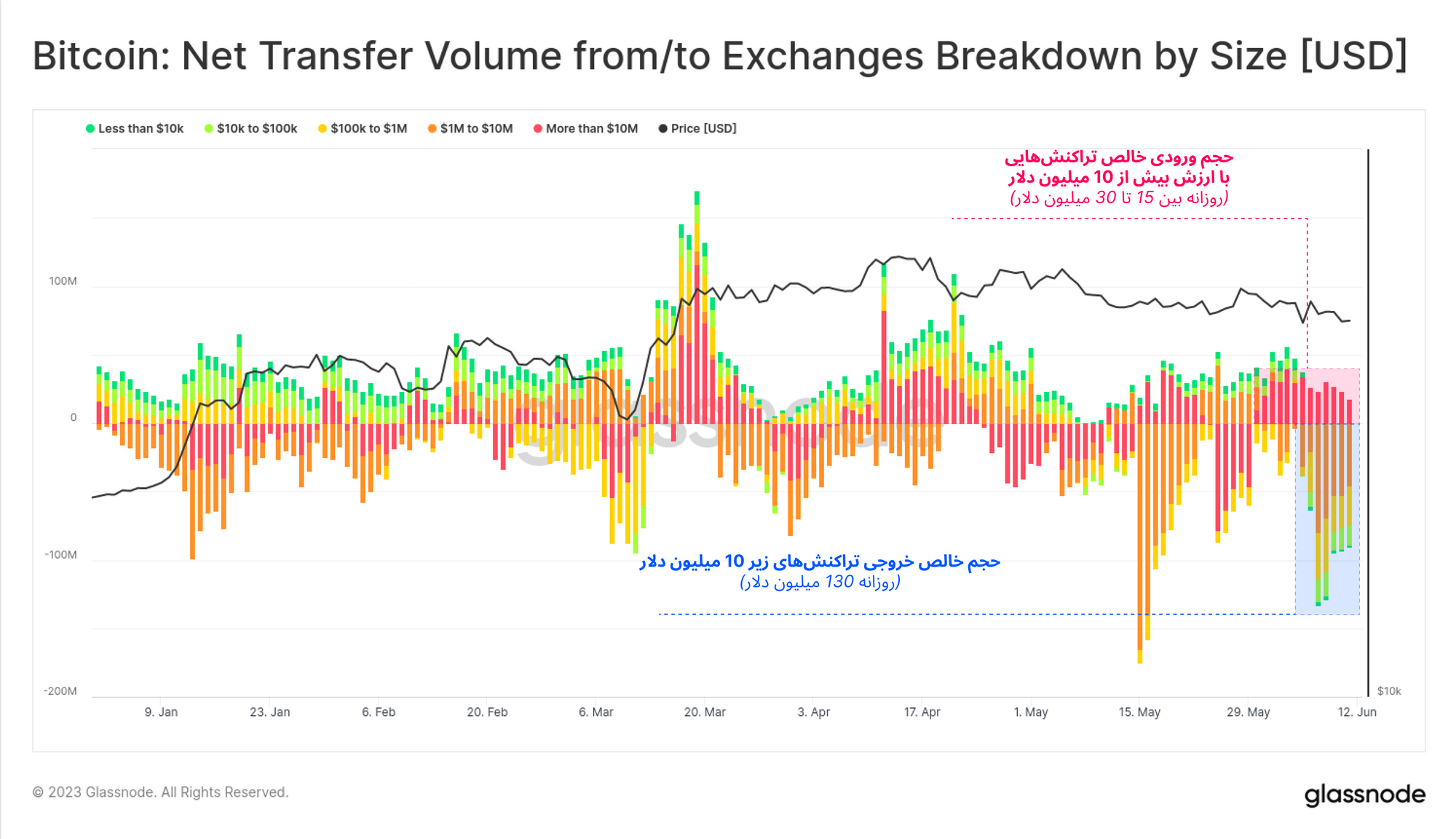 🔵 تراکنشهایی که ارزش آنها کمتر از ۱۰ میلیون دلار است، طی هفته گذشته به صورت خالص، روزانه ۱۳۰ میلیون دلار از صرافیها خارج کردهاند.