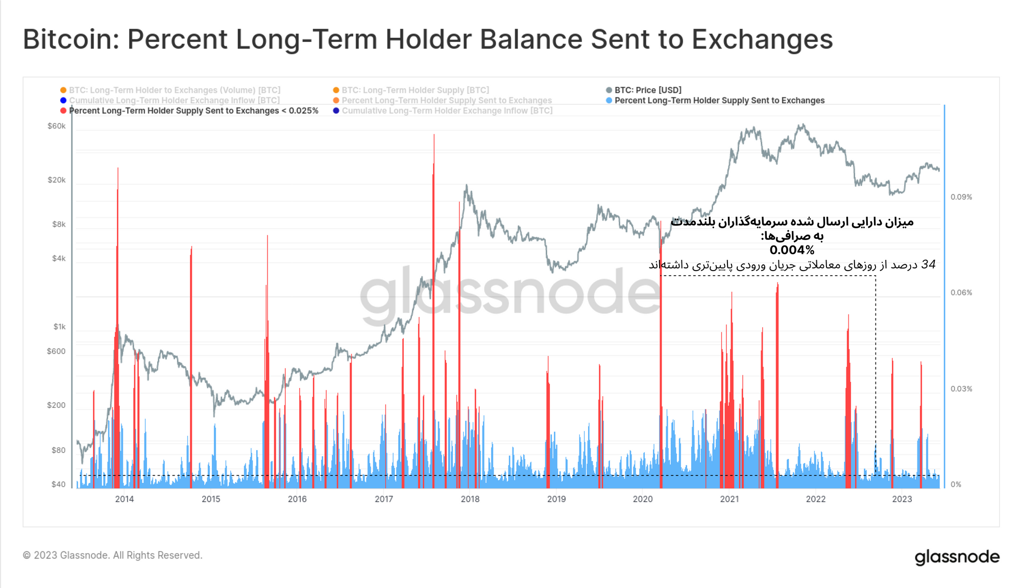 از طرفی سرمایهگذاران بلندمدت همچنان آرامش خود را حفظ کرده و واکنش هیجانی به اخبار اخیر نشان ندادهاند. این سرمایهگذاران صرفاً ۰.۰۰۴٪ از دارایی خود را به صرافیها فرستادند و ۶۶٪ از روزهای معاملاتی جریان ورودی سنگینتری به صرافیها داشتهاند.