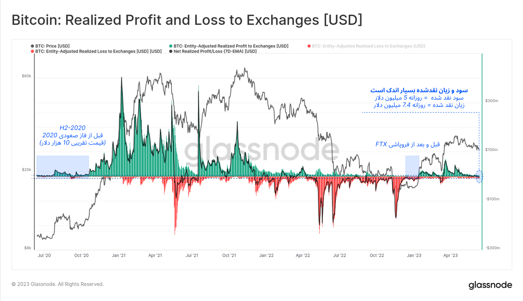 در نمودارهای قبل مشاهده کردیم که حجم بسیار اندکی از کوینها به صرافیها منتقل شدند. اکنون با توجه به سود و زیانی که هنگام انتقال کوینها به صرافیها نقد شده است؛ مجدداً به این نکته پی میبریم که سود و زیان نقد شده طی دو هفته اخیر بسیار ناچیز بوده است.