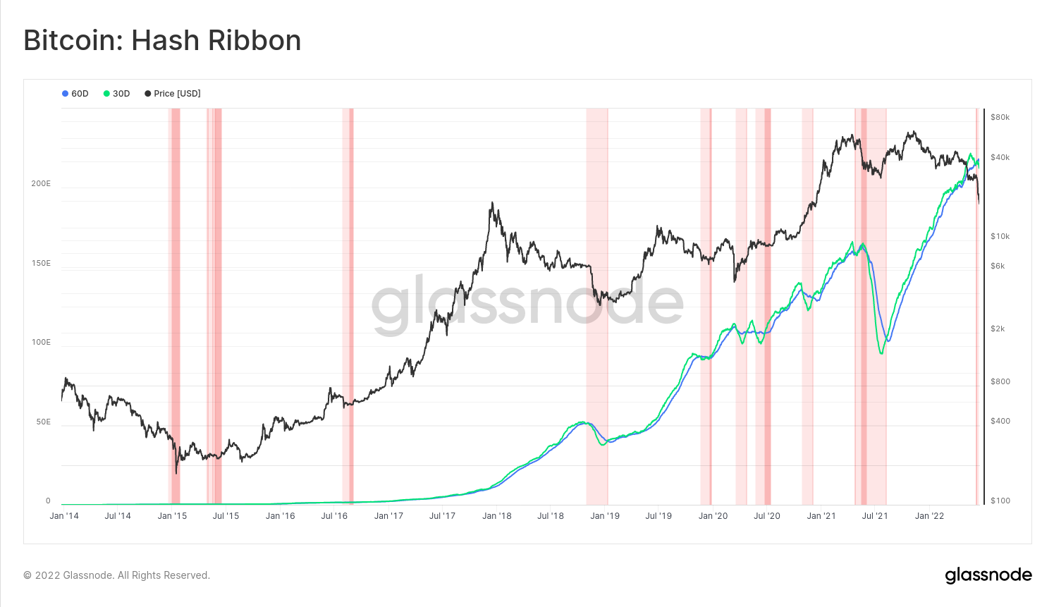 با مشاهده رفتار ماینرها میتوان گفت اکنون در مرحله تسلیم ماینرها هستیم زیرا هش ریت از ATH خود ۱۰ درصد پایین آمده است و هش ریت ۳۰ روزه و ۶۰ روزه رو به پایین یکدیگر را قطع کردند. به همین جهت میتوان گفت که دستگاههای ماینر به احتمال زیاد خاموش میشوند زیرا ماینکردن دیگر به صرفه نیست.