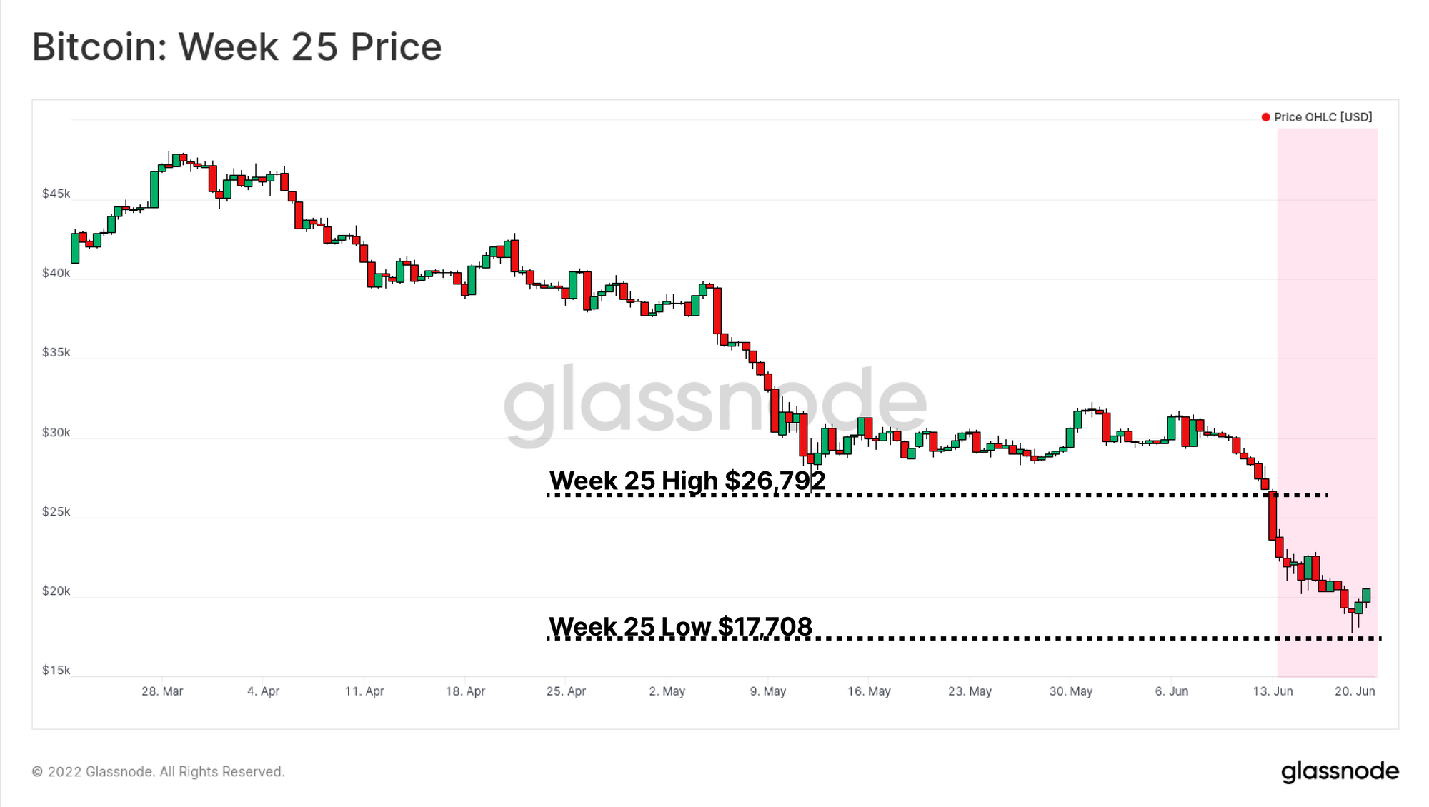 در روز هجدهم ژوئن، بازار به زیر قیمت ۲۰ هزار سقوط کرد و تا کف قیمتی ۱۷,۷۰۸ دلار پیش رفت. با این حال قیمت دوباره توانست در روز یکشنبه به محدوده ۲۰ هزار دلار برگردد. از آن جایی که تنها رمزارزها در روزهای تعطیل هفته قابل معامله بودند، نگرانی درباره شرایط اقتصادی و سیاسی جهان و تقاضا برای دلار، باعث خروج نقدینگی شدید از این بازار شد. در نتیجهی این ریزش سنگین در بازار که بسیاری از مشتریان نهادهای وامدهی دنیای DeFi و صرافیها را دچار بحران کمبود وثیقه کرد، در این هفته شاهد تسلیم شدن برخی از دسته بازیگران مهم مانند ماینرها و سرمایهگذاران بلندمدت بودیم.