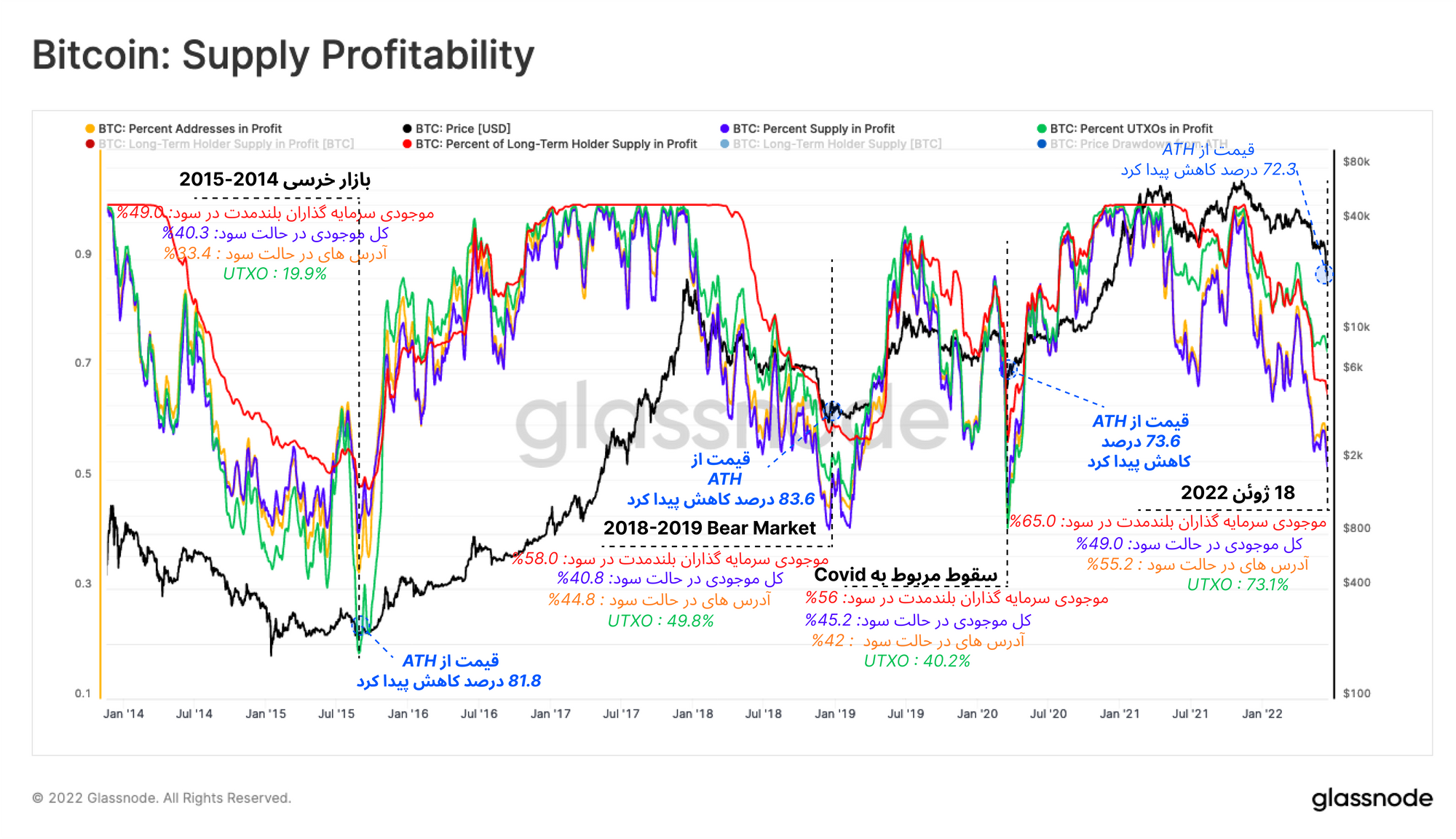 · معیار UTXO in Profit(سبز)، سودآوری بازار را بر اساس UTXO ها مشخص میکند. در نمودار زیر ۲۶.۷ درصد تمام UTXO ها در حالت ضرر قرار دارند. در بازارهای خرسی قبلی، کف بازار خرسی زمانی ایجاد شده که ۵۰.۲ تا ۸۱.۱ درصد تمام UTXO ها در ضرر باشند.