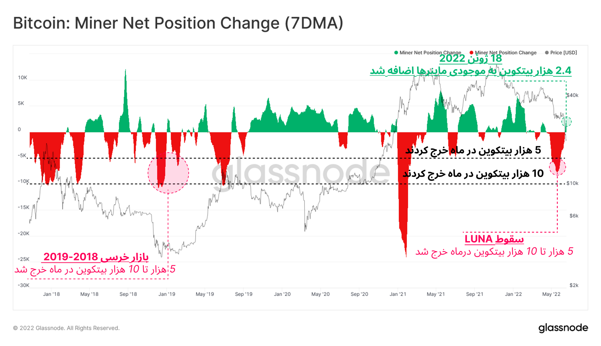 با فشاری که به ماینرها وارد شده، ماهانه بین ۵ هزار تا ۸ هزار بیتکوین از خزانه خارج میکنند. این مقدار خروج بیتکوین با تسلیم بازار در سال ۲۰۱۸-۲۰۱۹ قابل مقایسه است. پس از اینکه بیتکوین حمایت ۲۸ هزار دلار را از دست داد، ماینرها دست از خرج کردن برداشتند و به صورت میانگین ماهانه ۲.۲ هزار بیتکوین به خزانهشان اضافه کردند.