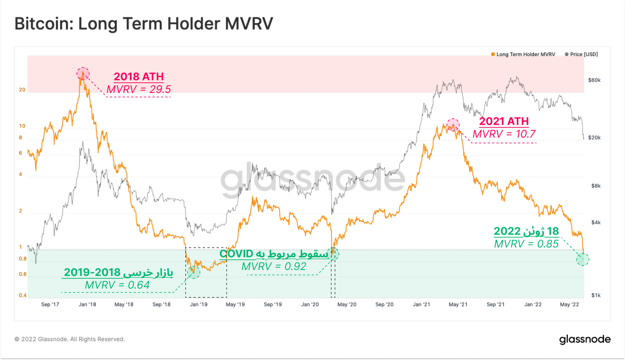 با کمک معیار LTH - MVRV، نقاطی را که سرمایهگذاران بلندمدت تحت فشار بودند میتوان مشخص کرد. این معیار نسبت میان قیمت بازار و Realized Price (قیمت خرید) سرمایهگذاران بلندمدت را مشخص میکند. زمانی که بازار تا ۱۷.۶ هزار سقوط کرد، این معیار تا مقدار ۰.۸۵ پیش رفت. به عبارتی دیگر ۱۵ درصد از ضرر نقد نشده بازار، متعلق به سرمایهگذاران بلندمدت است. سقوط اخیر این معیار تقریبا عمیق تر از سقوط مربوط به Covid بود اما هنوز به اندازه بازار خرسی ۲۰۱۸-۲۰۱۹ عمیق نیست.