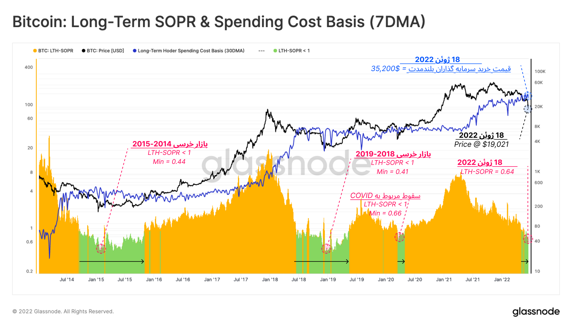 با افزایش ضررهای نقد نشده سرمایهگذاران بلندمدت، معیار LTH-SOPR نشان میدهد که سرمایهگذاران بلندمدت با فروش بیتکوینهای خود، چه مقدار ضرر نقد کردند. این معیار قیمت بازار را با قیمت خرید بیتکوینهایی که سرمایهگذاران بلندمدت خرج میکنند مقایسه میکند.
