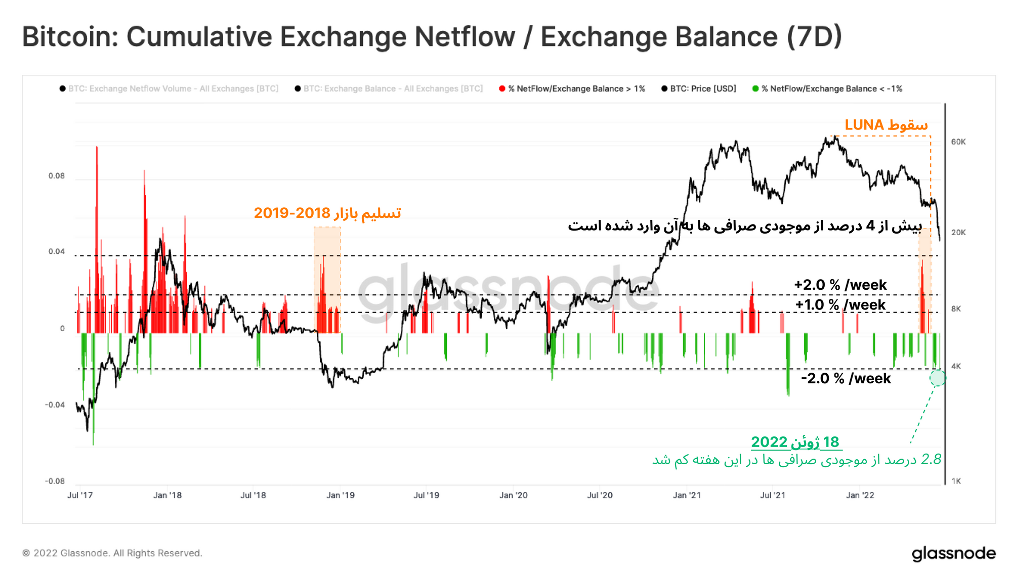 · در حال حاضر (۱۸ ژوئن) ۲.۸درصد موجودی صرافی از آن خارج شده است که این مقدار تقریبا با میزان بیتکوینی که پس از سقوط مربوط به Covid از صرافیها خارج شد، برابر است.