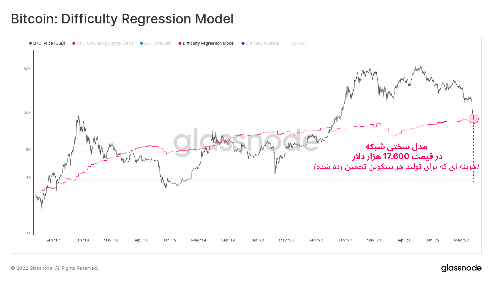 مانند انواع کالاهای دیگر ، بین قیمت بیتکوین و قیمت تولید آن نیز رابطه ای وجود دارد و بعد از مدتی قیمت کالا به قیمت تولید آن کالا باز می گردد. با ایجاد مدلی میان سختی شبکه و Market Cap ، میتوانیم به صورت میانگین هزینه تولید بیتکوینهای ماین شده را مشخص کنیم.