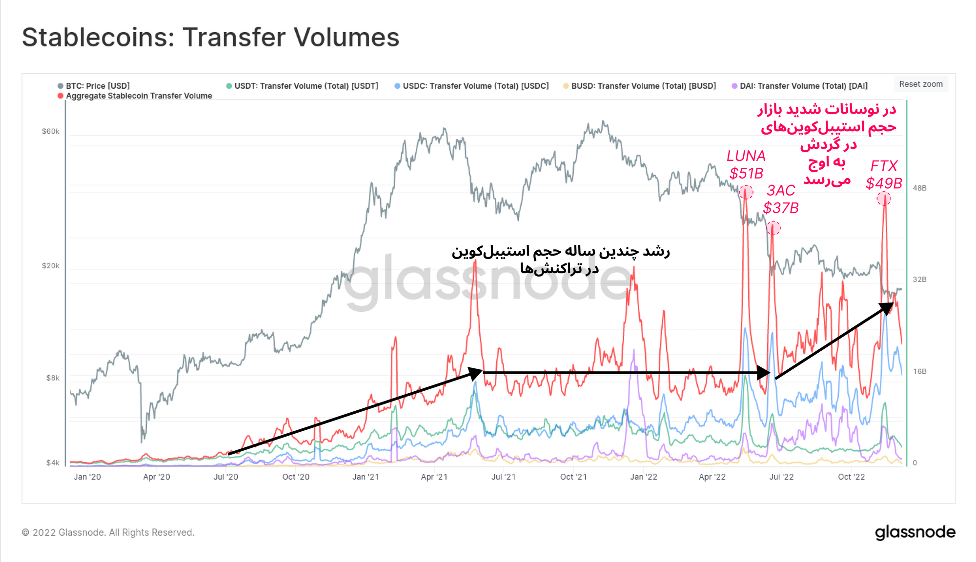 زمانی که قیمت در ماههای می، ژوئن و نوامبر نوسانات ریزشی عمیقی را تجربه کرد، به دلیل افزایش تقاضای سرمایهگذاران برای نقدینگی دلاری، حین کمبود وثیقه و بحران نقدینگی بازار، حجم استیبلکوینهای در حال گردش به ۳۷ تا ۵۱ میلیارد دلار رسید.