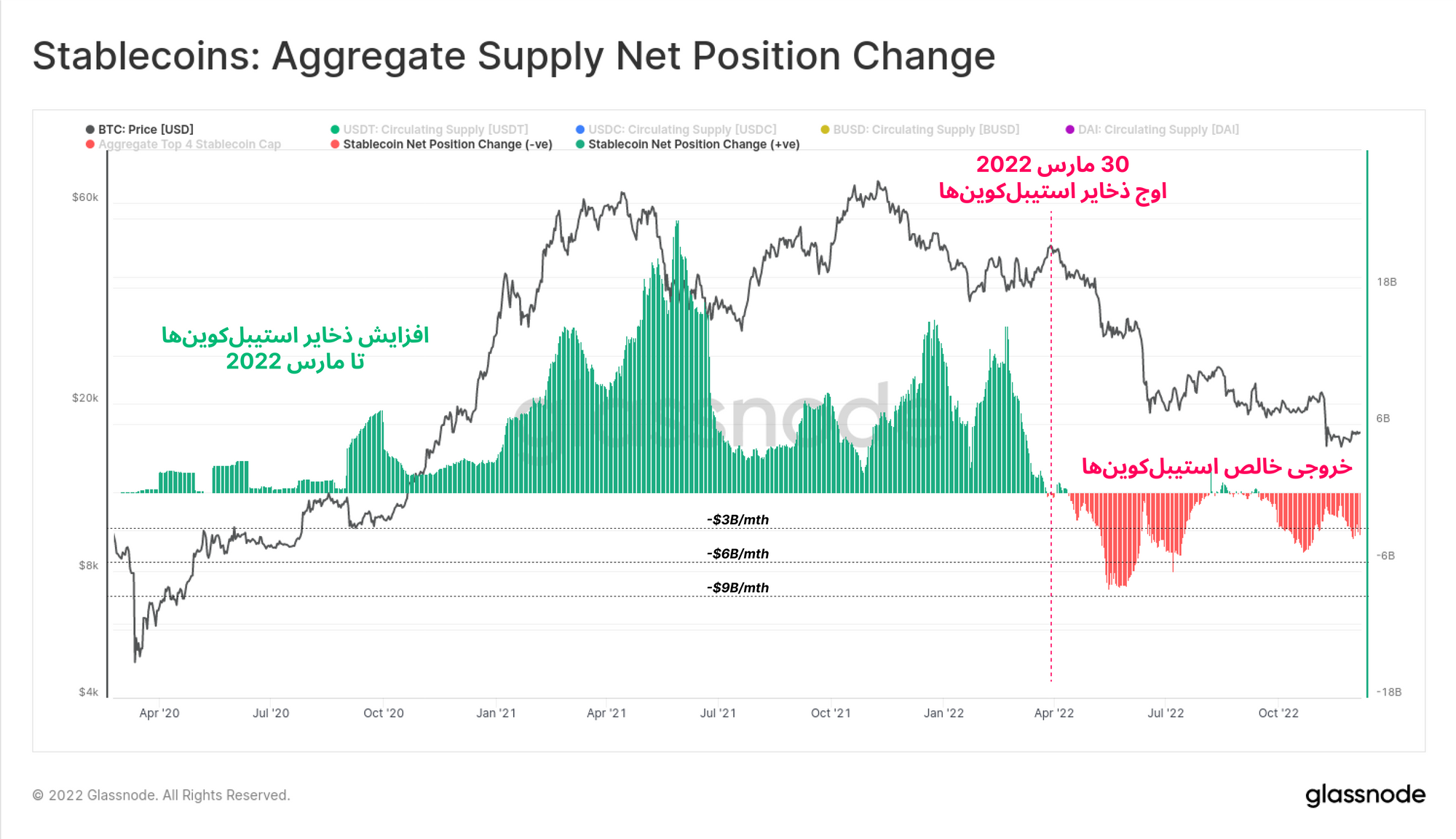 بنابراین پس از ماه مارس تاکنون، ماهیانه بین ۴ تا ۸ میلیارد دلار از ذخایر استیبلکوینها خارج شده است. البته این حجم از استیبلکوین خارج شده، تنها معادل ۸ درصد از اوج میزان استیبلکوینها در مارس ۲۰۲۲ را تشکیل میدهد. بنابراین هنوز حجم سرمایه بسیاری در استیبلکوینها باقی مانده است.