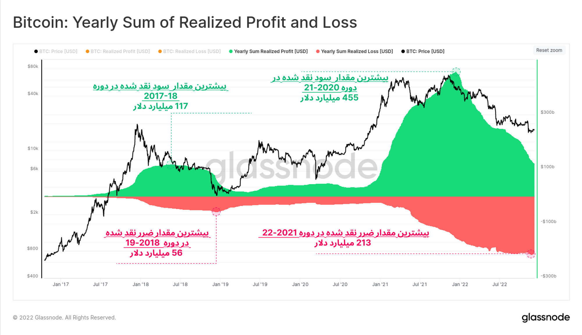 با عبور از این بازه زمانی، فاز نزولی بازار آغاز شد و سرمایهگذاران در معاملات خود حدود ۲۱۳ میلیارد دلار ضرر نقد کردند. مقدار زیانی که در فاز نزولی بازار نقدشده، با ۴۶.۸ درصد سودی که در بازه زمانی ۲۰۲۰-۲۰۲۱ نقده شده، برابر است. همچنین در سال ۲۰۱۸ نیز سناریوی مشابهی را مشاهده میکنیم که سرمایهگذاران در معاملات زیانآور ۴۷.۹ درصد از سود خود را دوباره به بازار پس دادهاند.
