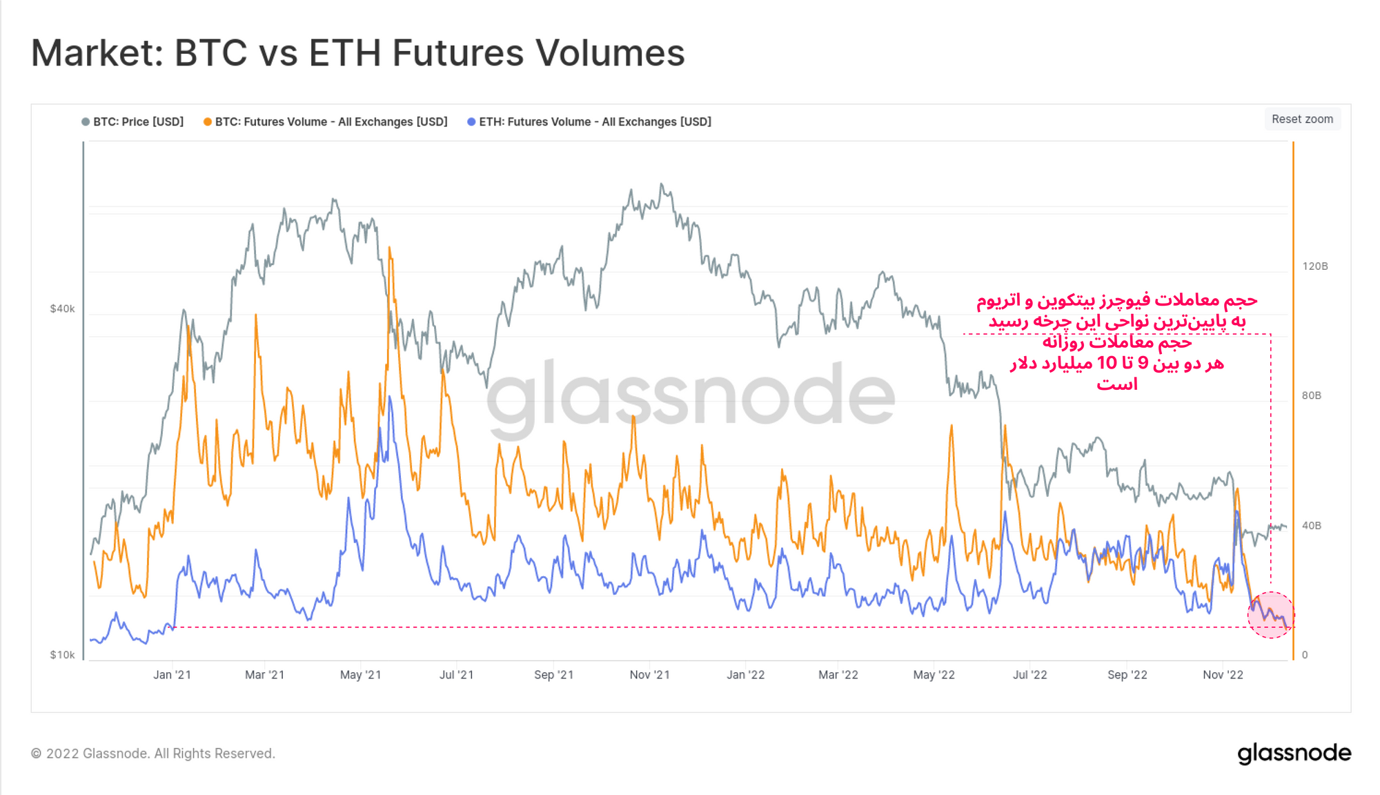 نمودار زیر ارزش معاملات فیوچرز بیتکوین 🟠 و اتریوم 🔵 را نشان میدهد. طبق این نمودار حجم معاملات بازار فیوچرز نیز به همین صورت بسیار راکد و به کف چندین ساله خود رسیده است. ارزش معاملات بازار فیوچرز اتریوم و بیتکوین، تقریباً در حجم یکسانی بین ۹.۵ میلیارد تا ۱۰.۶ میلیارد دلار حرکت میکند. از دلایل رکود حجم معاملات بازار فیوچرز، میتوان به بحران نقدینگی گسترده و خسارتهای مالی بسیاری از بنگاههای وامدهی و نهادهای معاملاتی اشاره کرد.