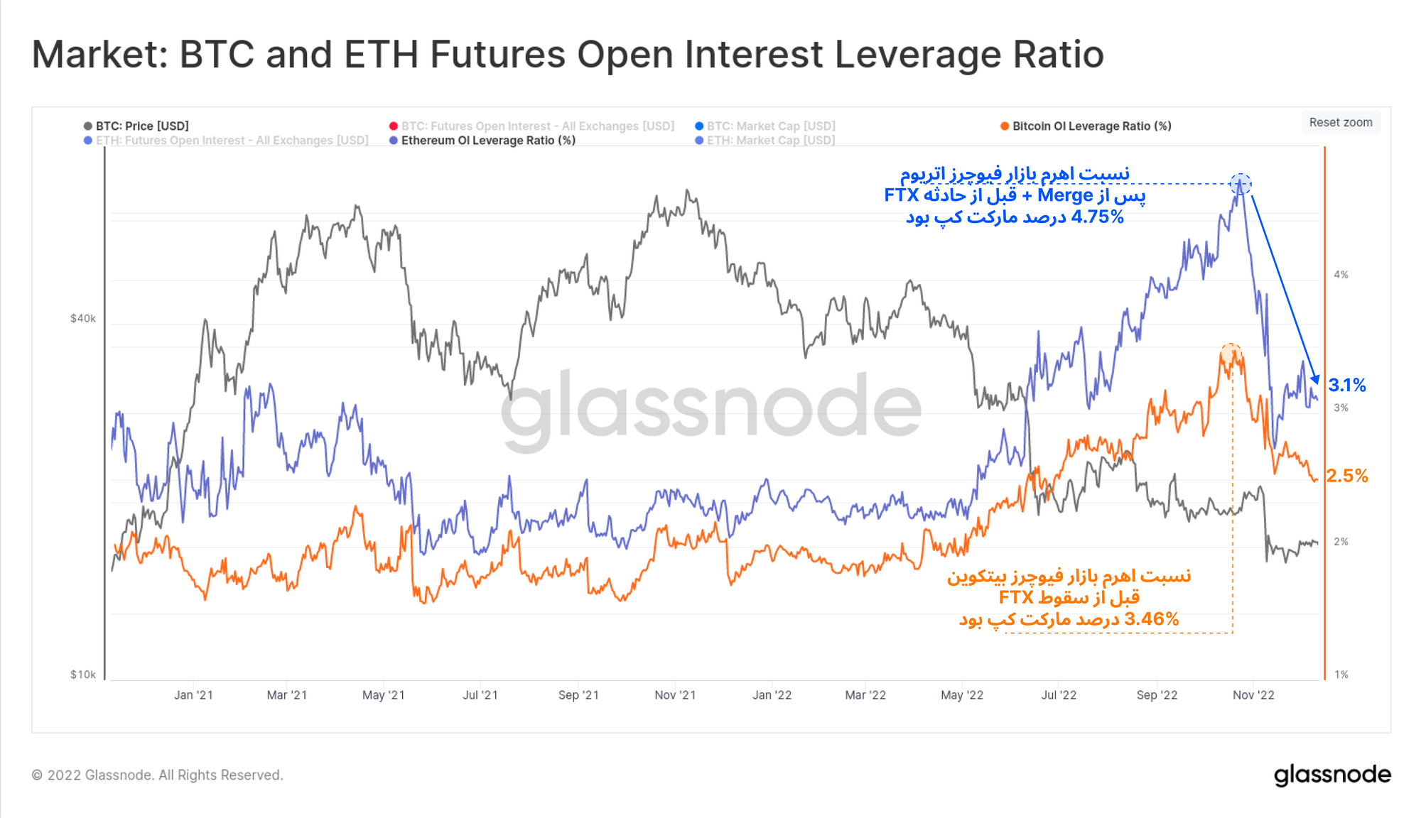 همانطور که در نمودار زیر مشاهده میکنید، پس از سقوط صرافی FTX، معاملات اهرمی نسبت به ارزش بازار به میزان قابل توجهی فروکش کردهاند. طبق نمودار وقوع این حادثه برای بازار اتریوم بسیار سنگینتر تمام شده است؛ احتمالأ به این دلیل که معاملات اهرمی تقویمی (تاریخ انقضادار) که از زمان شرطبندی سرمایهگذاران روی آپدیت Merge تاکنون باز بوده، در حین این حواشی بسته شدهاند. حجم معاملات باز اتریوم از ۴.۷۵ درصد به ۳.۱۰ درصد Market Cap رسیده است. حجم معاملات باز بیتکوین نیز یک هفته قبل از بازار اتریوم به سقف خود رسید و سپس طی یک ماه اخیر از ۳.۴۶ درصد Market Cap به ۲.۵۰ درصد افت داشت.