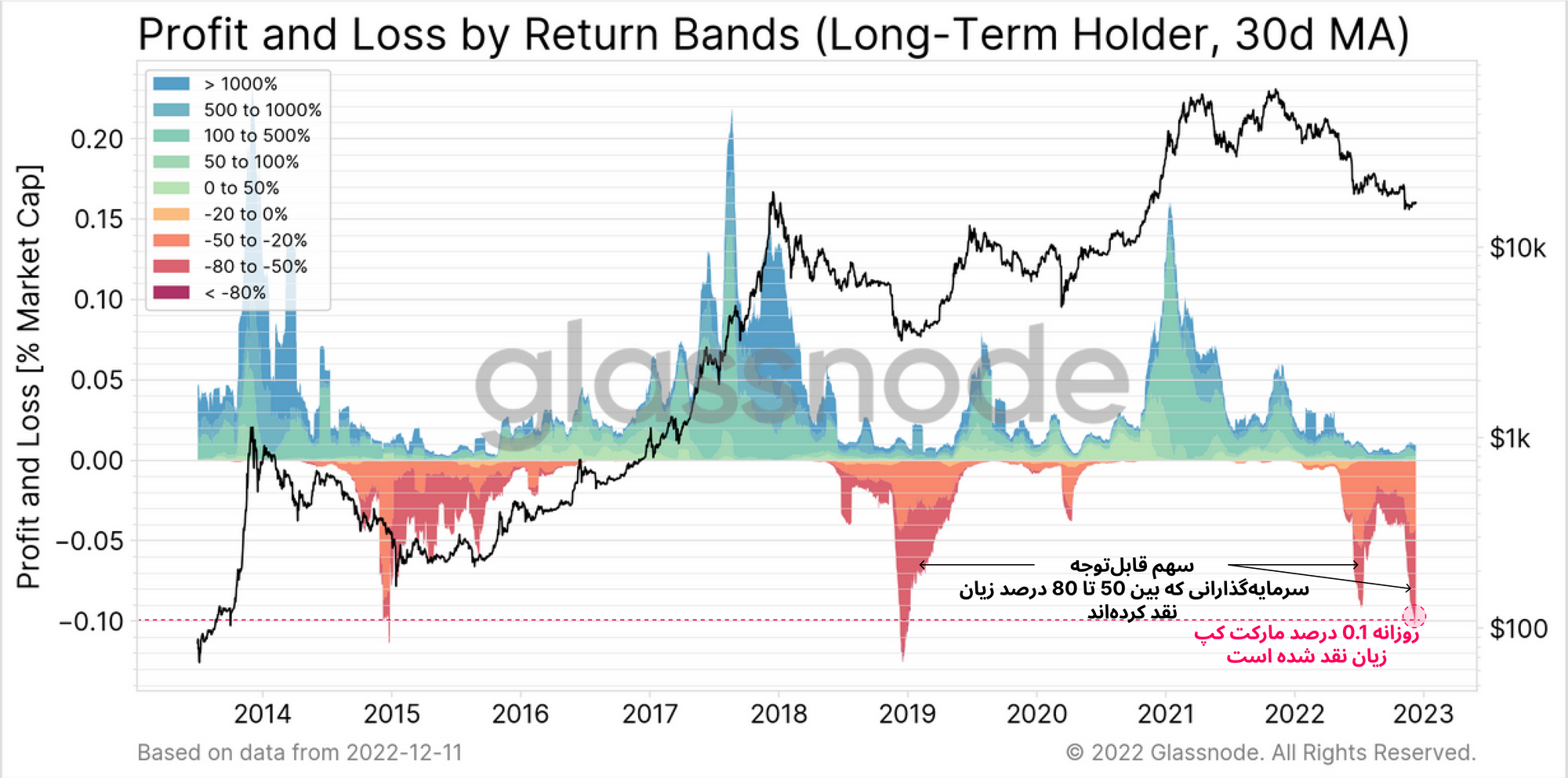 یکی از نکات مهم این بخش، سهم قابل توجهی است که سرمایهگذاران بلندمدت از زیان نقد شده در معاملات بازار داشتهاند. نمودار زیر نمایانگر سود و زیان نقد شده سرمایهگذاران بلندمدت است. این سرمایهگذاران در چرخه فعلی دو مرتبه معاملات خود را با سنگینترین حجم زیان نقد کردهاند. اولین زیانآوری قابل توجه این سرمایهگذاران در ماه نوامبر رخ داده که روزانه معادل ۱۰ درصد Market Cap دچار زیان شده و آن را در معاملات خود نقد کردند. این مقدار زیانآوری را تنها با چرخه ۲۰۱۵ و ۲۰۱۸ میتوان مقایسه کرد. دومین زیانآوری مورد توجه نیز در ریزش قیمت ماه ژوئن رخ داد که روزانه معادل ۰.۰۹ درصد Market Cap در معاملات این سرمایهگذاران زیان نقد شده است.