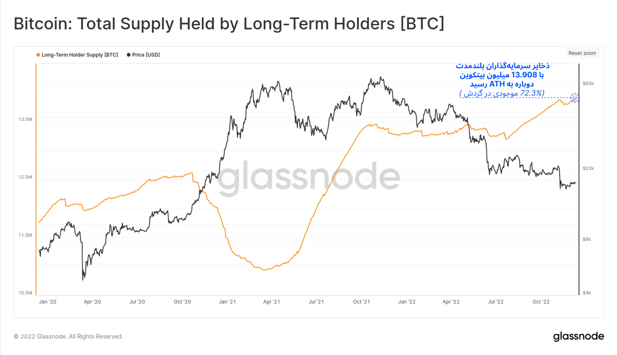 در نمودار زیر روند صعودی پیوستهای در میزان ذخایر سرمایهگذاران بلندمدت مشاهده میکنید، این روند پیوسته به این معناست که در ماه ژوئن و جولای ۲۰۲۲، انباشت سنگینی توسط سرمایهگذاران بلندمدت صورت گرفته است؛ به عبارتی عدهای از این سرمایهگذاران دقیقاً بعد از شکست 3AC و بحران وامدهندگان، شروع به انباشت کرده و تاکنون ذخایر خود را خرج نکردهاند.