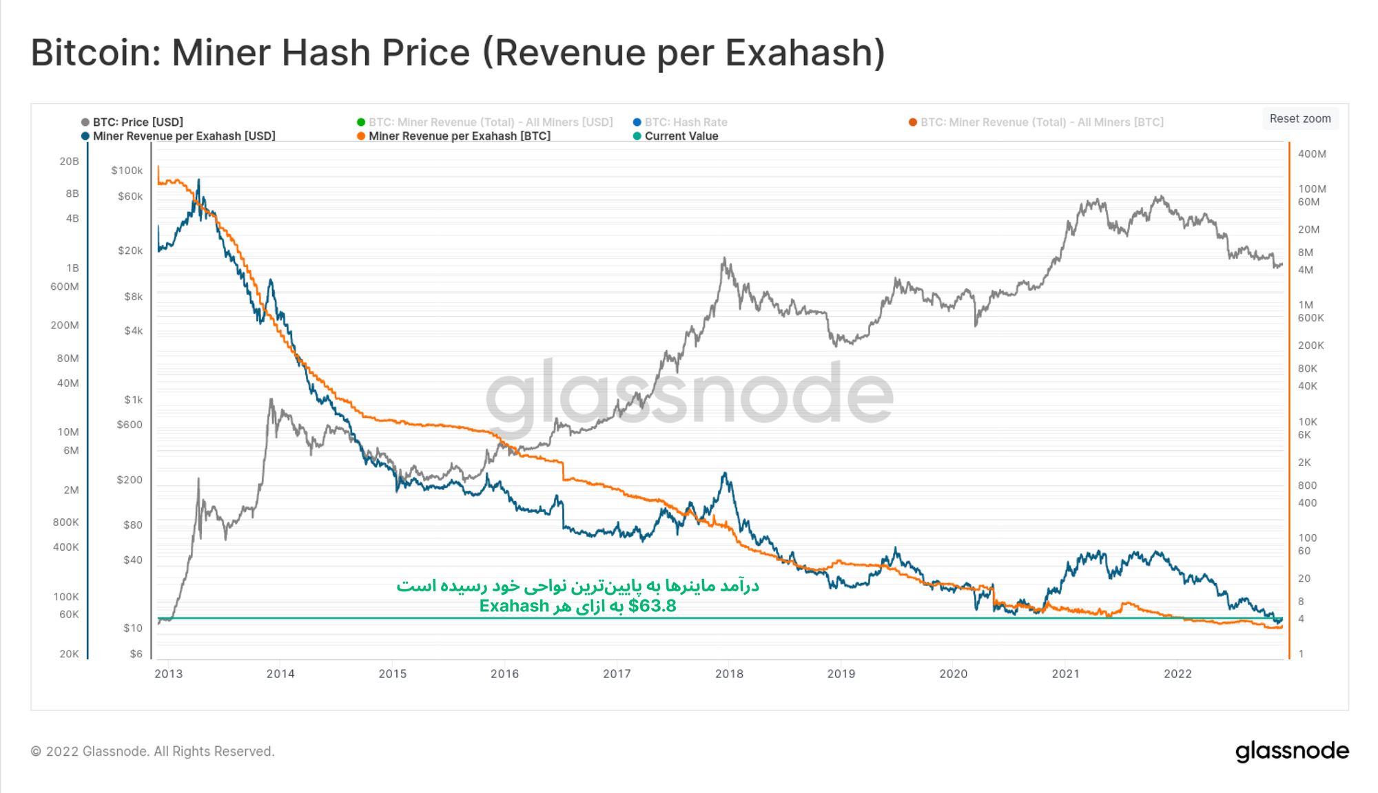 بنابراین تعجبی ندارد که درآمد ماینرها به پایینترین مقدار خود برسد. نمودار زیر Hash Price و یا به عبارتی درآمد ماینرها را به ازای هر Exahash نشان میدهد (درآمد بیتکوینی 🟠درآمد دلاری 🔵). طبق نمودار با وجود اینکه قیمت فعلی بیتکوین (۱۷ هزار دلار) نسبت به قیمت اکتبر سال ۲۰۲۰ (۱۰ هزار دلار)، ۷۰ درصد بیشتر است، اما درآمد ماینرها نسبت به حداقل سطح درآمدی ماینرها در سال ۲۰۲۰ کمتر است. بنابراین میتوان گفت که ماینرهای بیشتری برای دریافت پاداش استخراج بیتکوین با یکدیگر رقابت میکنند و قدرت محاسباتی آنها نسبت به سال ۲۰۲۰، ۷۰ درصد افزایش پیدا کرده است. بنابراین به همین دلیل با وجود افزایش قیمت نسبت به سال ۲۰۲۰، شاهد کاهش درآمد ماینرها و در نهایت خاموش شدن تعدادی از دستگاههای ماینینگ هستیم.