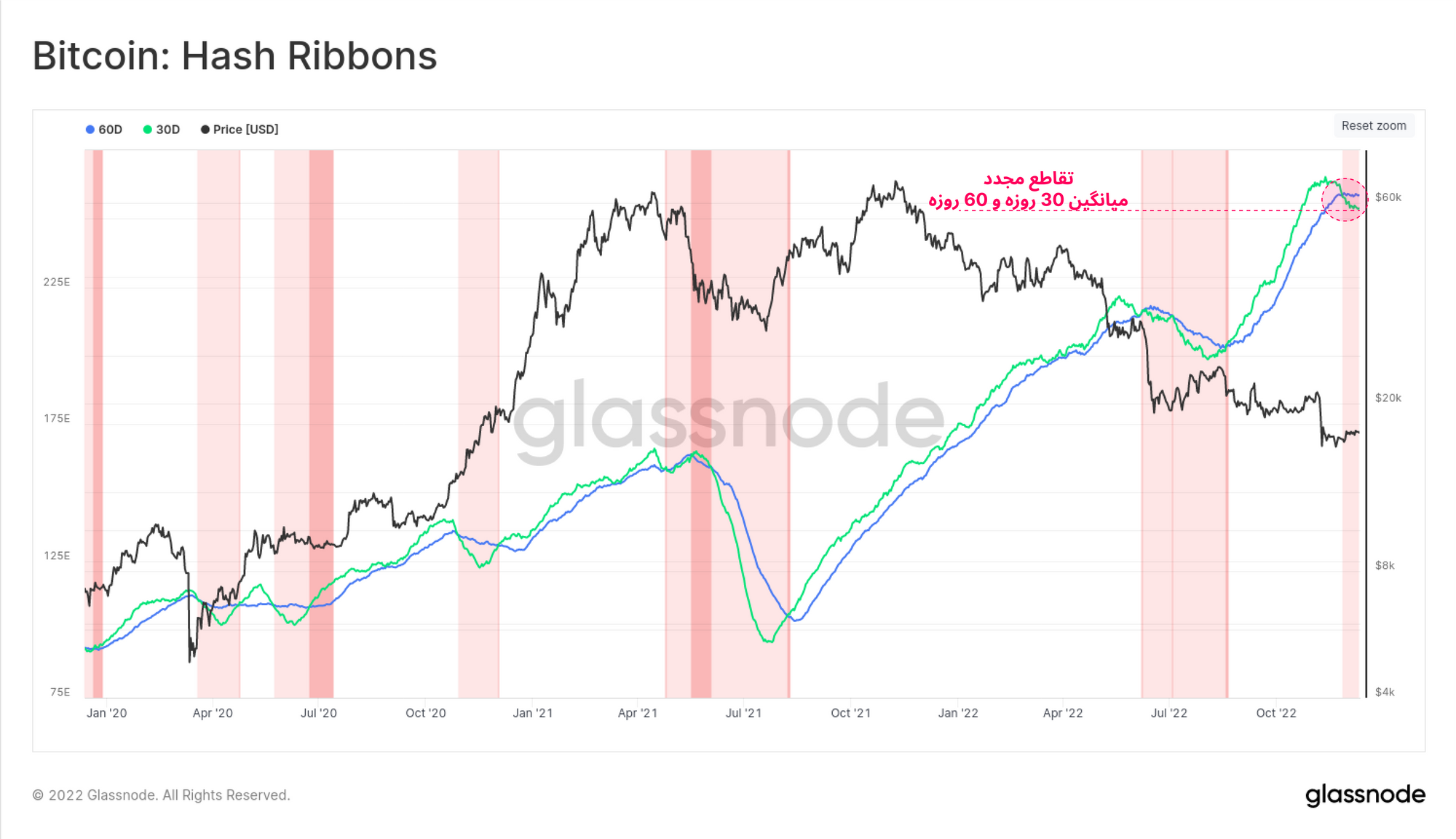 اکنون علت کاهش سختی شبکه در نمودار قبل، افت میزان هشریت شبکه است زیرا به دلیل افت قیمت بیتکوین و افزایش هزینههای انرژی، ادامه فعالیت برای بسیاری از ماینرها به صرفه نخواهد بود. به همین جهت طبق نمودار Hash Ribbon مشاهده میکنیم که به دلیل خاموشی برخی از دستگاههای ماینینگ و در نتیجه کاهش سختی شبکه، میانگین ۳۰ روزه این معیار به زیر میانگین ۶۰ روزه فروکش کرده است.