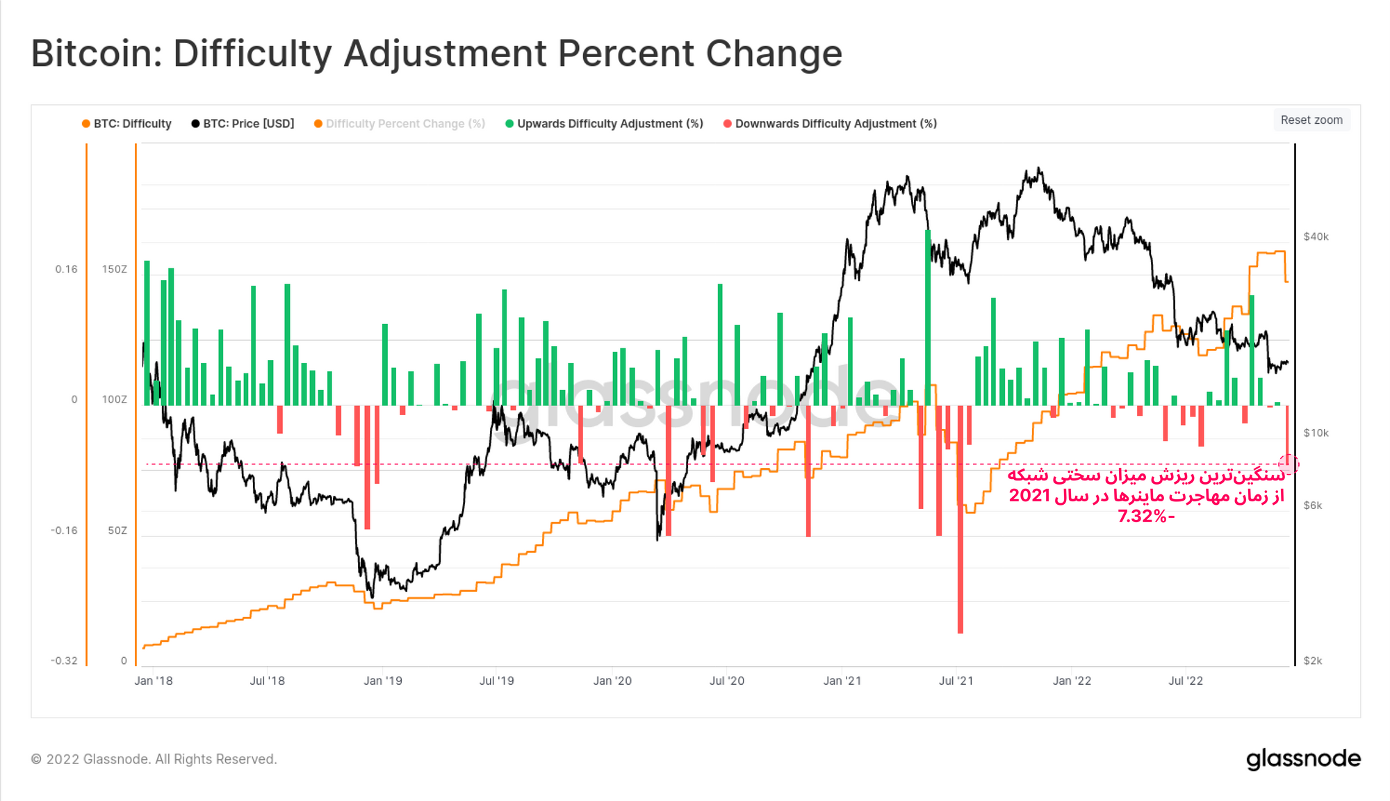 در بخش پایانی تحلیل آنچینی بیتکوین، به وضعیت فعلی ماینرها میپردازیم. نمودار زیر میزان تغییر در سختی استخراج بلاکهای جدید شبکه را نشان میدهد. سختی شبکه بیتکوین از زمان مهاجرت ماینرها در ماه جولای ۲۰۲۱، در هفته گذشته سنگینترین ریزش را به میزان ۷.۳۲ درصد تجربه کرد. فشارهای مالی و کاهش درآمدی ماینرها سبب شده تا برخی از ماینرها مجبور به خاموش کردن دستگاههای ماینینگ خود شوند و به همین علت سختی ماینینگ در شبکه بیتکوین کاهش قابل توجهی پیدا کرده است.