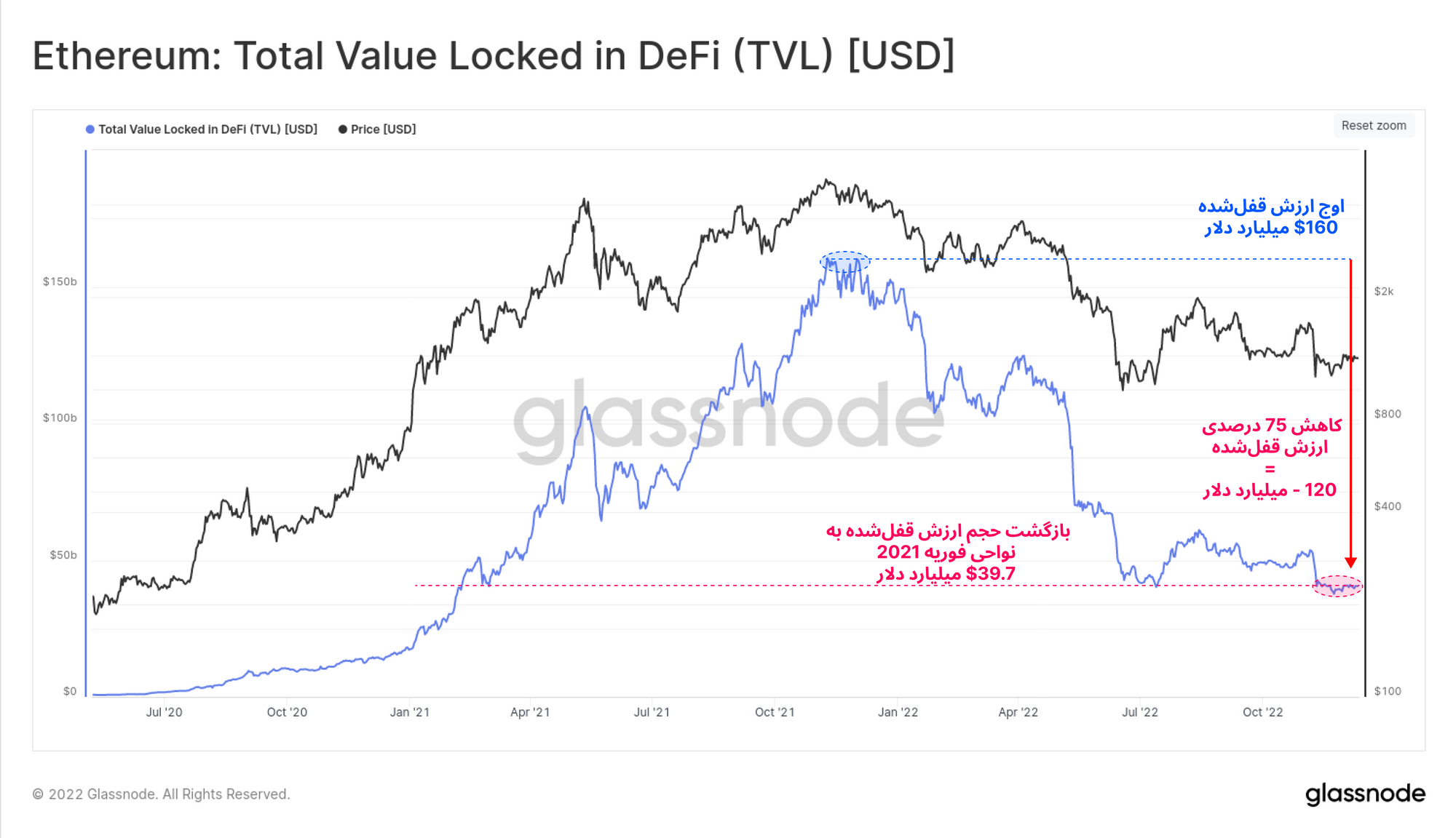 نمودار زیر حجم TVL را نشان میدهد. TVL به کل ارزش قفل شده و یا به عبارتی ارزش دلاری کوینهایی که به بخش وامدهی، استیکینگ و یا استخرهای نقدینگی Defi سپرده شده، گفته میشود. از آنجایی که بسیاری از توکنهای Defi ارزش خود را از دست داده و به شدت دچار بحران نقدینگی شده اند، کل ارزش دلاری که در تمام بخشهای Defi سپرده شده (TVL)، ریزش عمیقی را تجربه کرده است. این حجم از ارزش قفلشده Defi در سقف قیمتی نوامبر ۲۰۲۱ به ۱۶۰ میلیارد دلار رسیده بود اما پس از رسیدن به اوج خود، تا کنون با کاهش ۷۵ درصدی، ۱۲۰.۳ میلیارد دلار از این میزان کاهش پیدا کرده است. در حال حاضر حجم TVL در Defi به رقم ۳۹.۷ میلیارد دلار و به نواحی فوریه ۲۰۲۱ بازگشته است.