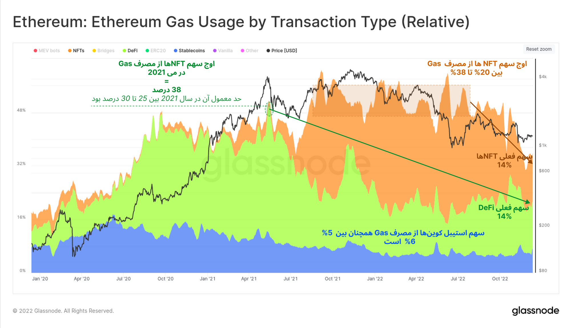 در نیمه اول سال ۲۰۲۱، حدود ۲۰ تا ۳۸ درصد Gas شبکه اتریوم در تراکنشهای بخش NFT مصرف شده است، اما سهم این تراکنشها در میزان استفاده از Gas تاکنون ۱۴ درصد کاهش پیدا کرده است.