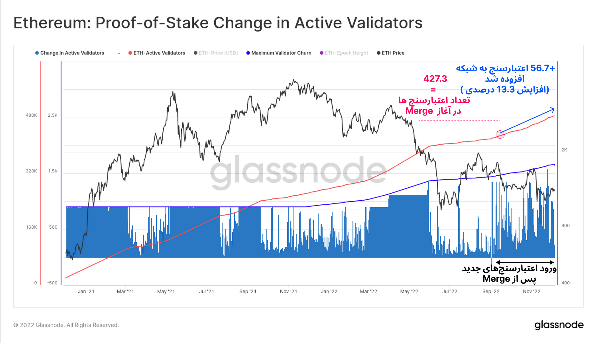 از تاریخ فعالشدن Merge تاکنون بیش از ۴۸۴ هزار اعتبار سنج در شبکه اتریوم فعال هستند که به عبارتی تعداد اعتبارسنجها از زمان آغاز فعالیت Merge حدود ۱۳.۳ درصد افزایش یافته است. در مجموع ۱۵.۶۱۸ میلیون کوین اتریوم در این شبکه استیک شده که این ذخایر معادل ۱۲.۸۹ درصد موجودی در گردش بازار اتریوم است.