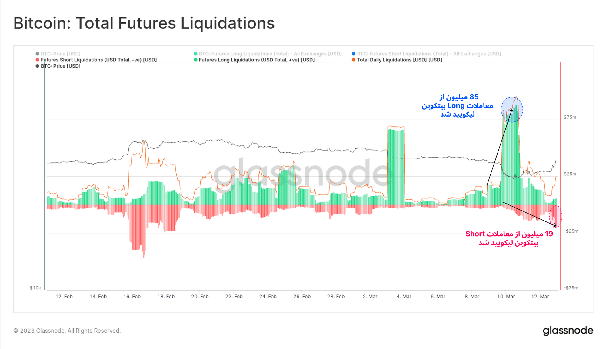 نوسانات قیمتی این هفته عمدتاً به دلیل لیکویید شدن معاملات Short و Long فیوچرز رخ داده است. در مسیر حرکت قیمت به سمت ۱۹ هزار دلار، حدود ۸۵ میلیون دلار به صورت معاملات Long و سپس در صعود قیمت تا ۲۲ هزار دلار، ۱۹ میلیون دلار از معاملات Short لیکویید شدند.
