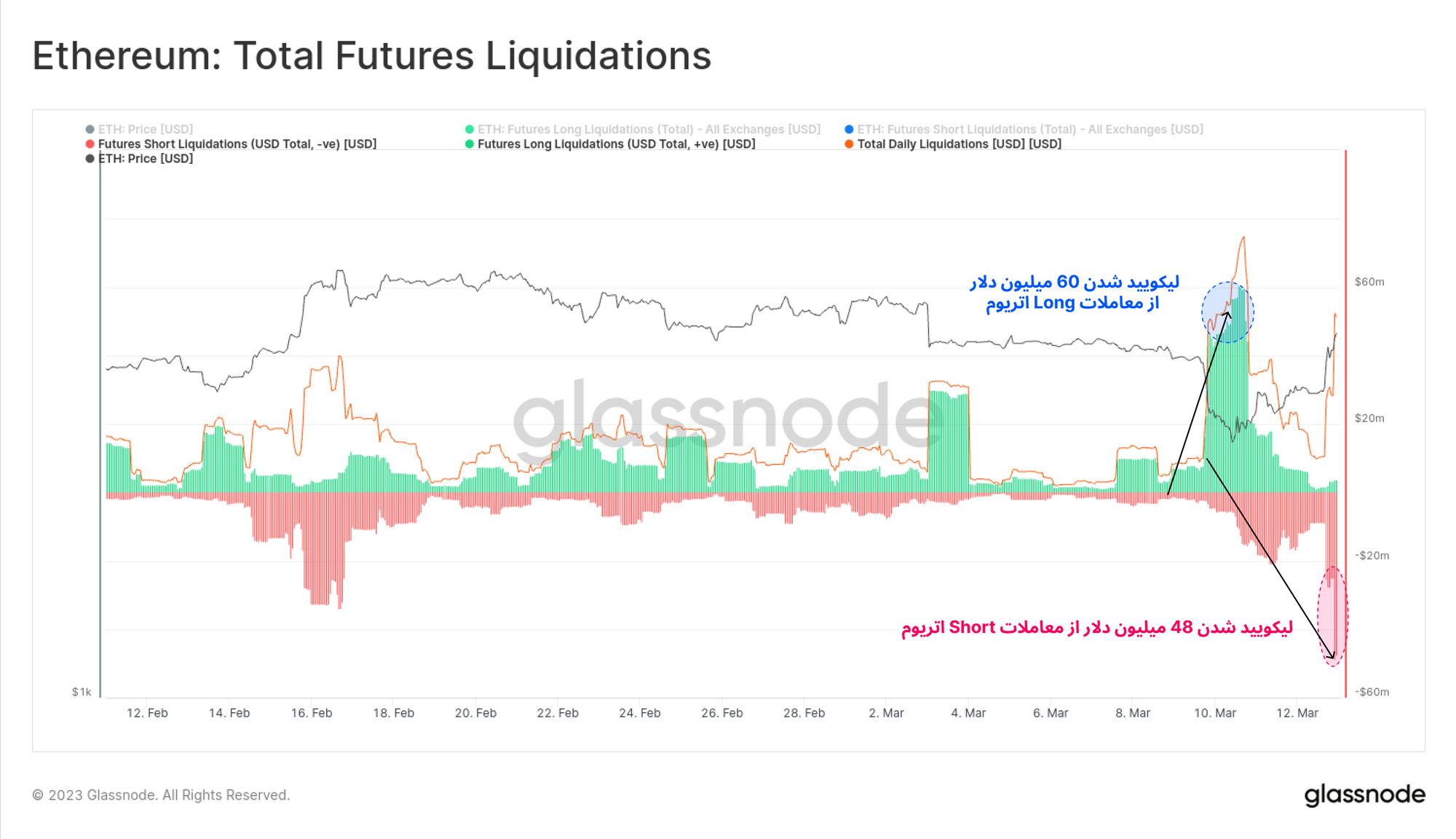 این جهتگیری منفی در معاملات، سبب لیکویید شدن بسیاری از معاملات Short در بازار اتریوم شد. در صعود قیمت به سمت ۱.۶ هزار دلار، بیش از ۴۸ میلیون دلار معامله Short، معادل ۲.۵ برابر حجم معاملاتی که در بازار بیتکوین به اجبار بستهشدهاند، لیکویید شد.