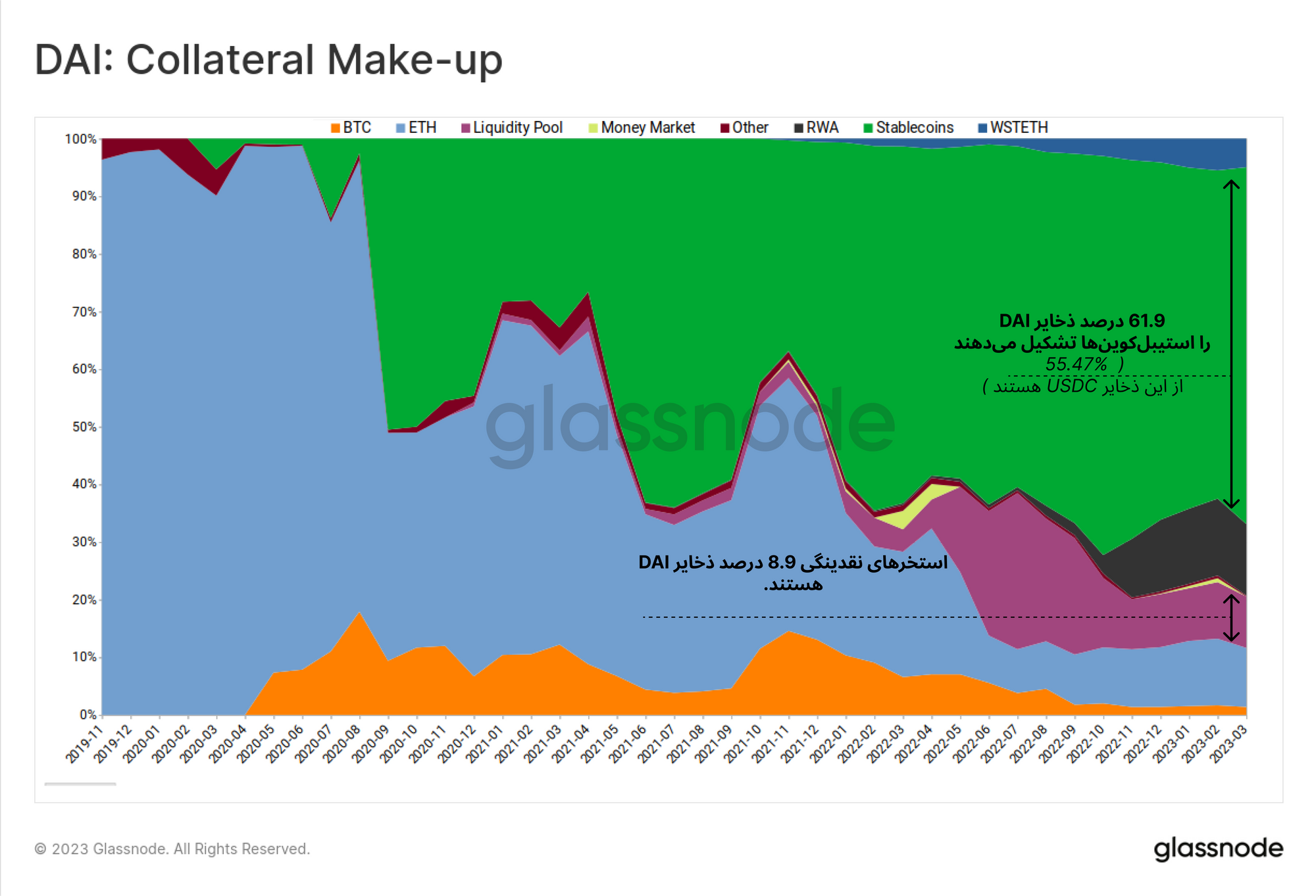 اکنون به بررسی ذخایر پشتوانه استیبلکوین DAI میپردازیم. همانطور که مشاهده میکنید، از اواسط سال ۲۰۲۰ اغلب ذخایر پشتوانه DAI را استیبلکوینها تشکیل دادهاند. USDC مستقیما حدود ۵۵.۵ درصد از پشتوانه DAI را تشکیل میدهد که با احتساب مقداری از استیبلکوینهای موجود در چندین استخر نقدینگی Uniswap ، میتوان گفت حدود ۶۳ درصد ذخایر پشتوانه DAI از نوع استیبل کوینها هستند.