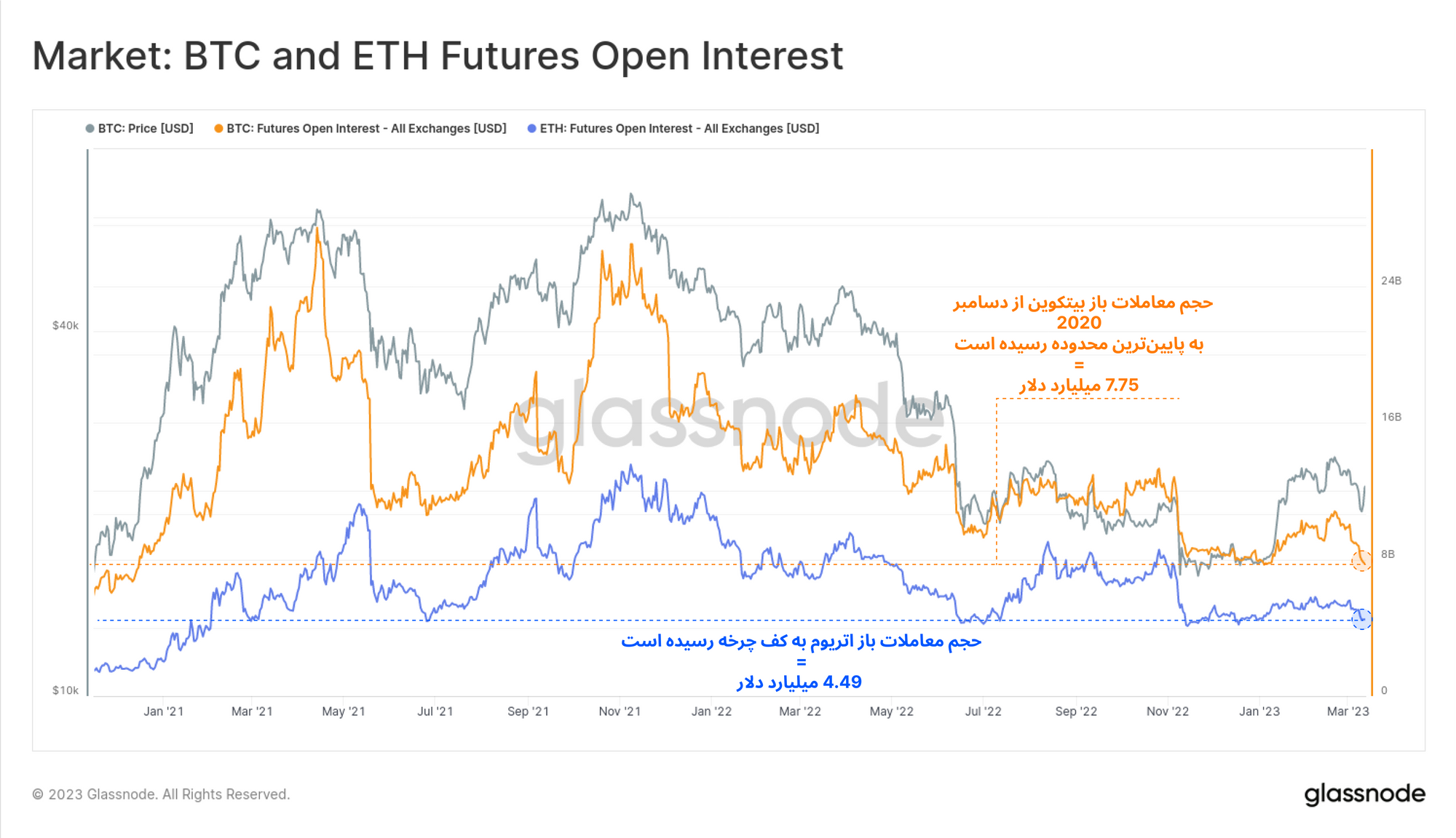 در این بخش، انعکاس رخدادهای اخیر را بر معاملهگران فیوچرز ارزیابی خواهیم کرد. در ماه گذشته، حجم معاملات باز فیوچرز بیتکوین و اتریوم به پایینترین محدوده چرخه و همچنین محدوده کف چند ساله خود رسید. معاملات باز فیوچرز بیتکوین با حجم حدودی ۷.۷۵ میلیارد دلار، ۶۳ درصد از تمام معاملات باز را تشکیل میدهد.