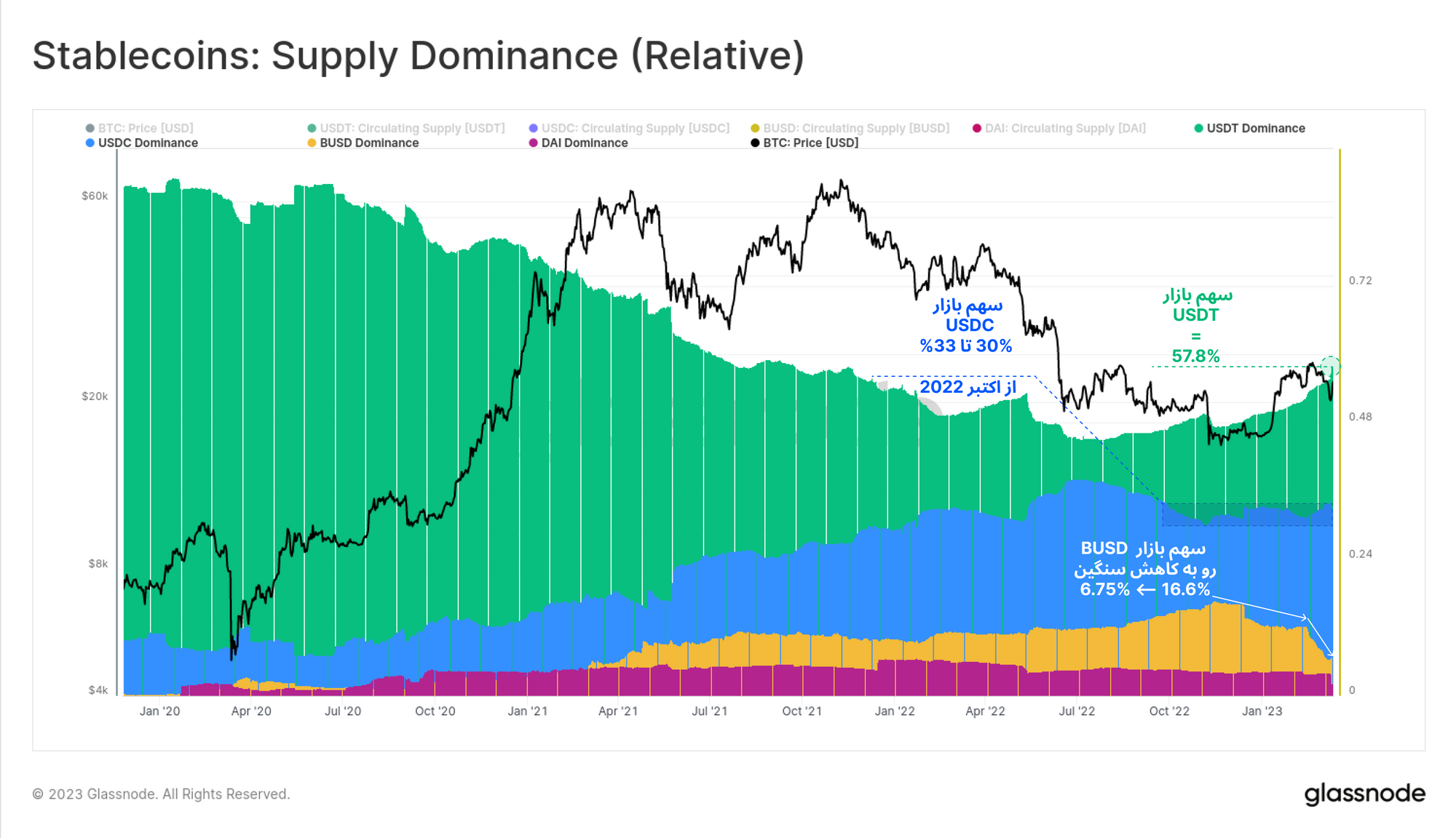 همانطور که در این گزارش به آن اشاره شده، از اواسط سال ۲۰۲۰، سهم USDT میان استیبلکوینهای دیگر، با روند نزولی رو به رو شد؛ اما با فشارهای قانونی اخیر علیه BUSD و نگرانیهای مرتبط با USDC ، استیبلکوین USDT مجددا ۵۷.۸ درصد سهم بازار را در دست گرفت.