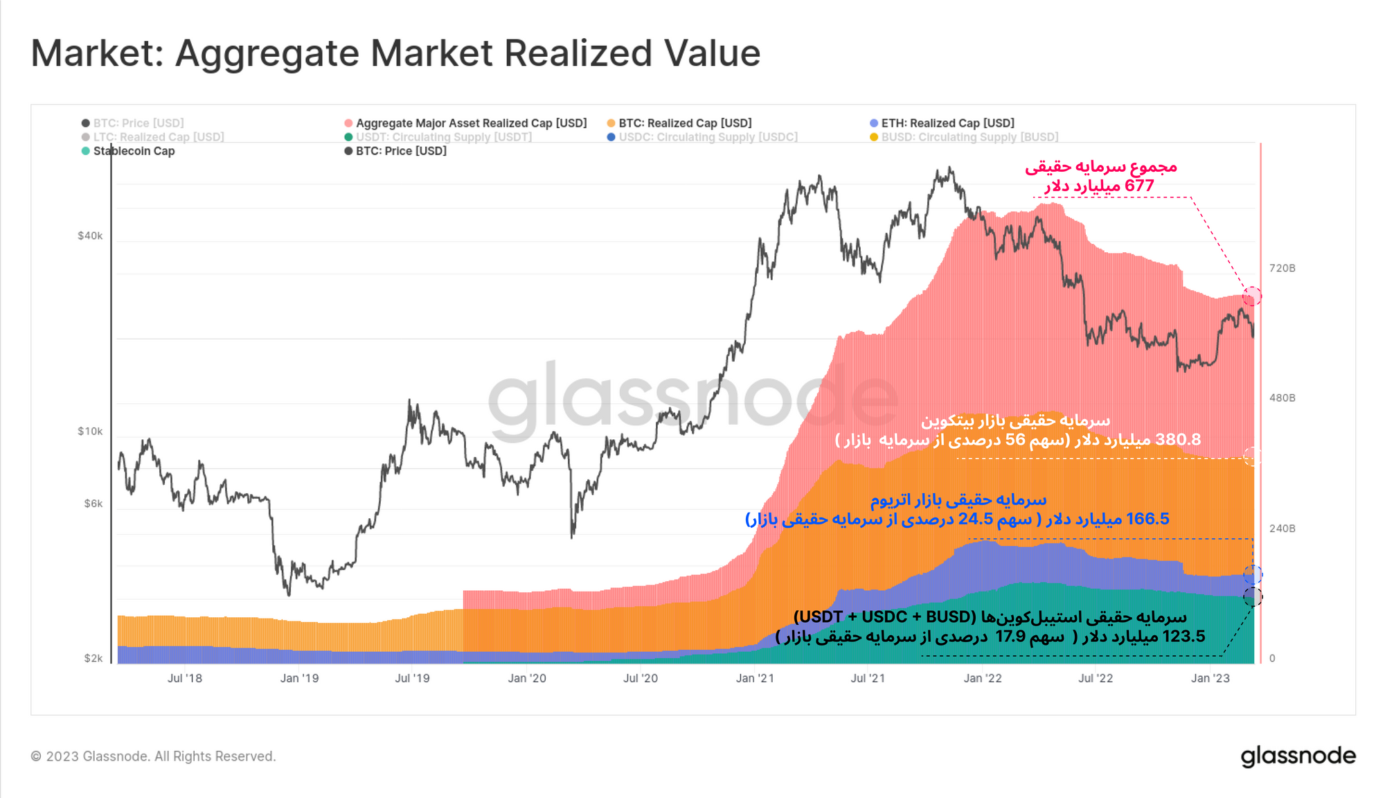 همانطور که در نمودار زیر مشاهده میکنید، در حال حاضر مجموع سرمایه حقیقی بازار ۶۷۷ میلیارد دلار است و حجم سرمایه حقیقی ۸۵۱ میلیارد دلاری در سقف قیمتی سال گذشته، تا این مقدار کاهش داشته است. حدود ۵۶.۴ درصد سرمایه حقیقی از طریق بیتکوین، حدود ۲۴.۵ درصد از طریق اتریوم و حدود ۱۷.۹ درصد از طریق USDT به بازار ورود پیدا کرده است. همچنین مجموع سهم USDC ، BUSD و LTC از جریان ورودی بازار ۱.۲ درصد است.