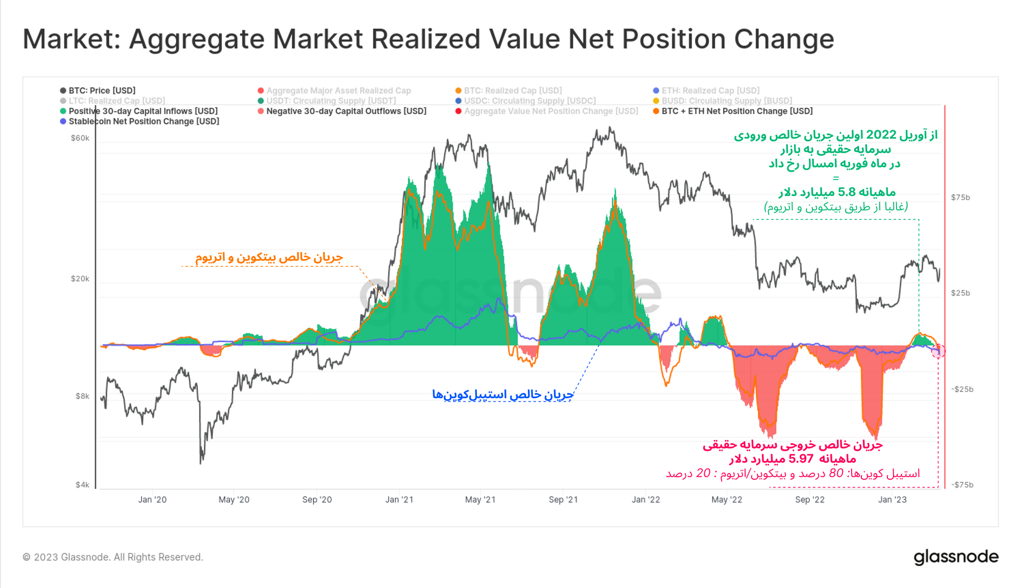تخمین میزان سرمایهای که به بازار جریان پیدا میکند، امر دشواریست؛ اما از آنجاییکه اغلب سرمایه بازار از طریق بیتکوین، اتریوم و استیبلکوینها به بازار ورود پیدا میکند، میتوان با در نظر گرفتن ترکیب Realized Cap بیتکوین، اتریوم و استیبلکوینهای مهم، میزان سرمایه ورودی به بازار را محاسبه کرد.