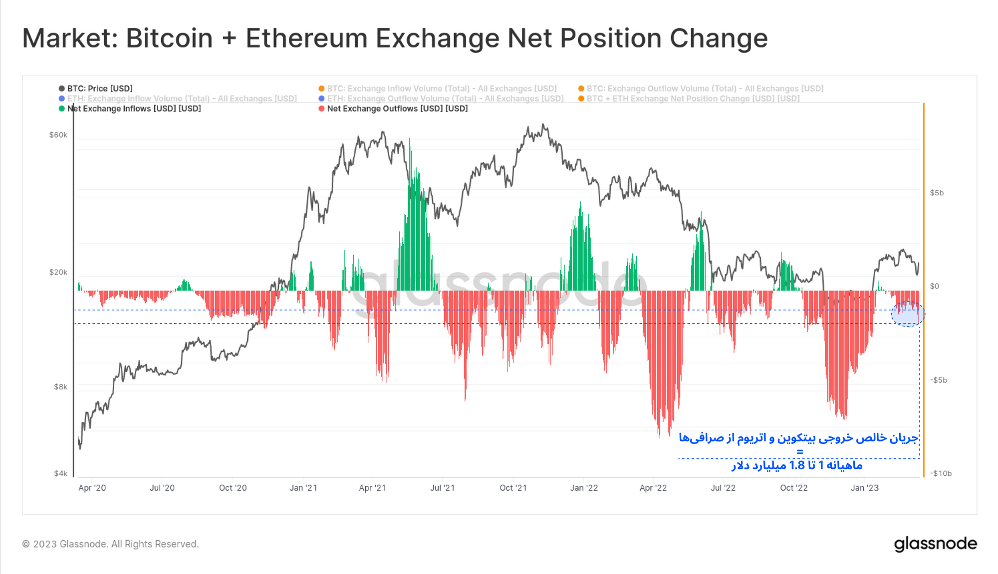 درصورتی که میزان خروجی بیتکوین و اتریوم را به صورت دلاری در نظر بگیریم، طی یک ماه اخیر حدود ۱.۸ میلیارد دلار به صورت بیتکوین و اتریوم از صرافیها خارج شده است. البته این مقدار خروجی در مقایسه با جریانات خروجی گذشته بسیار قابلتوجه نیست؛ اما در شرایط مشوش فعلی، خروج این میزان سرمایه از بازار، اعتماد و اطمینان سرمایهگذاران را به این نوع داراییها بیان میکند.