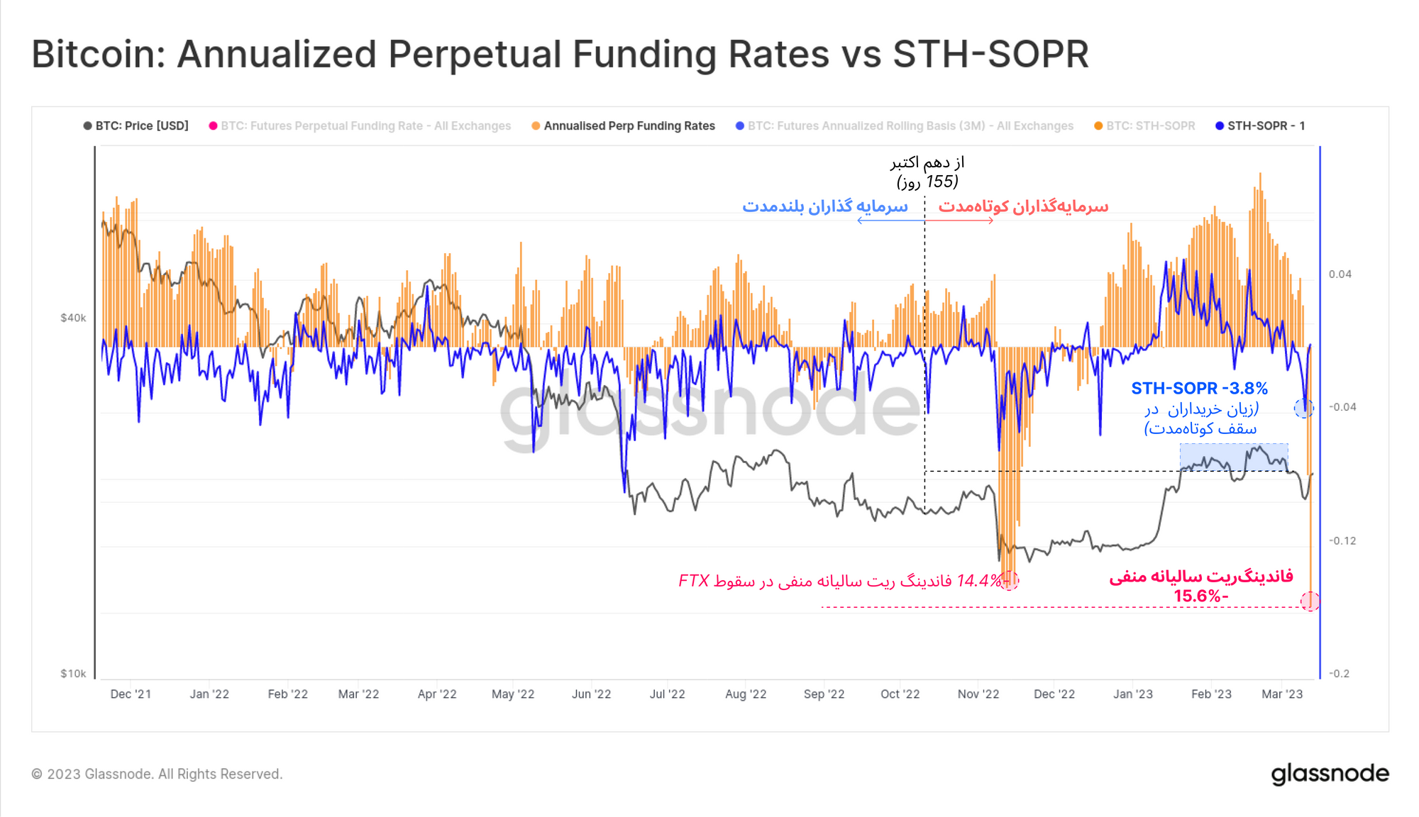 در بخش پایانی گزارش، واکنش سرمایهگذاران کوتاهمدت و واکنش بازار فیوچرز را در کنار یکدیگر ارزیابی خواهیم کرد. نمودار زیر STH- SOPR (سودآوری یا زیاناوری سرمایهگذاران کوتاهمدت )🔵 را در مقایسه با میزان فاندینگریت سالیانه معاملات فیوچرز به تصویر کشیده است : 🟠