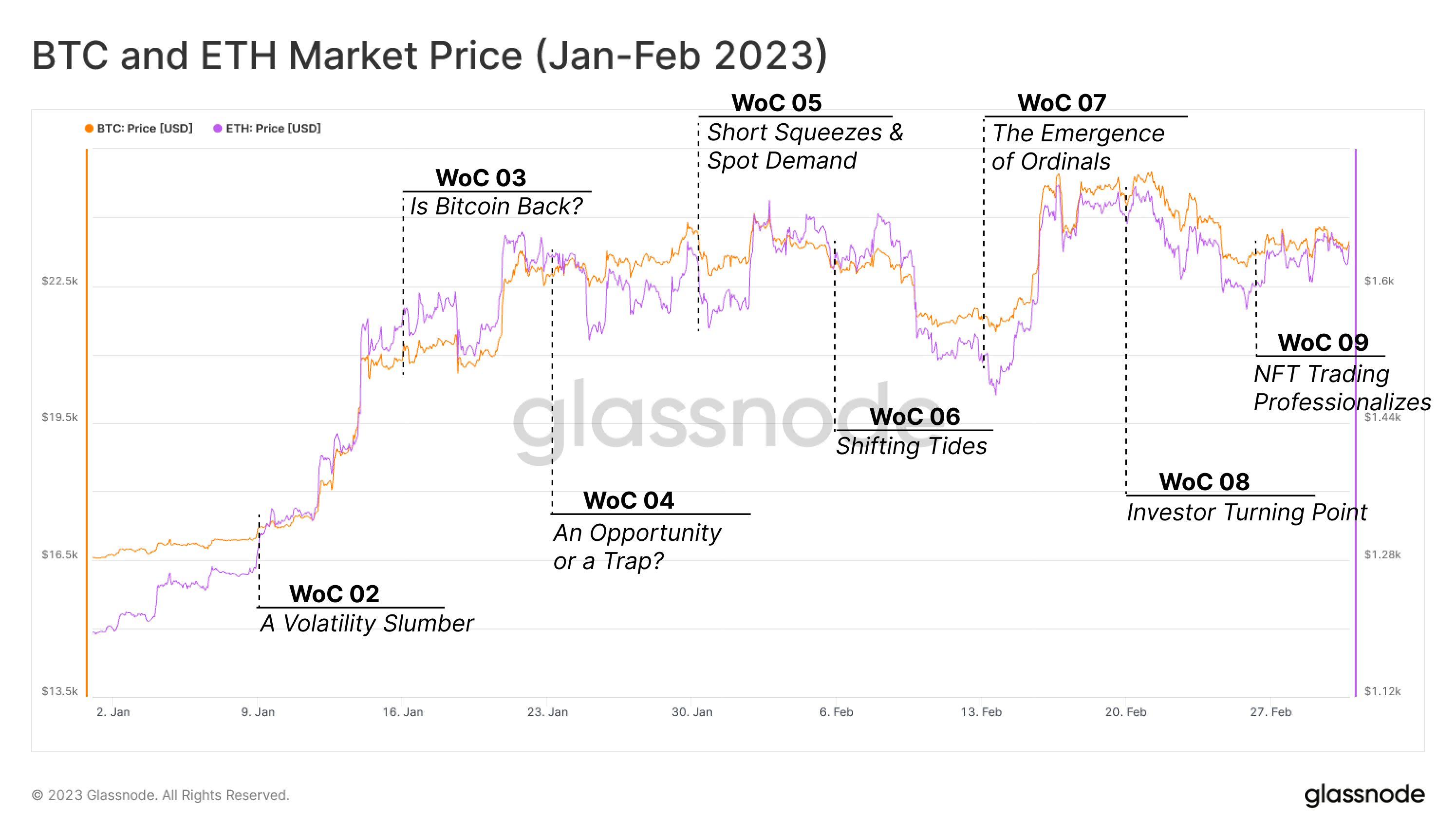 Alongside our flagship Week-On-Chain newsletters, the Glassnode Analyst team was busy at work preparing new bespoke research reports. These range from a comprehensive guide on spotting key inflection points for navigating through the transition from Bear to Bull, to an in-depth report on the rise of Ordinals and their realized and future implications for the fee market and chain size, and finally an educational piece on understanding one of On-Chain analytics greatest tools in the arsenal, the MVRV Ratio.