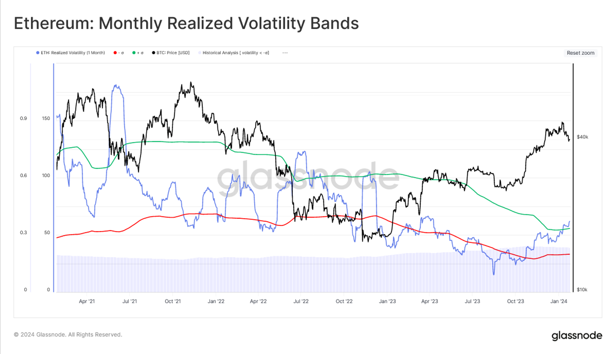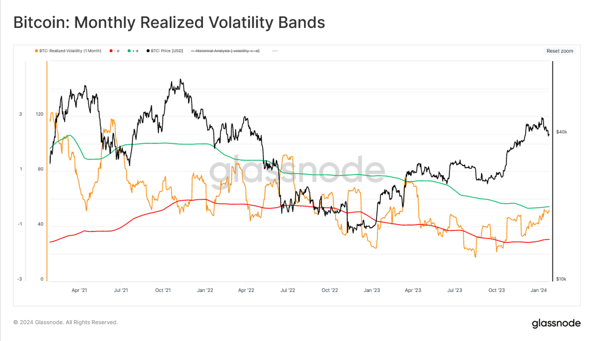 Both Bitcoin and Ethereum have witnessed a spike in monthly volatility, nearing statistically high levels. For momentum and directional traders, this increase in volatility serves as a critical indicator in the early stages of a bull market, signalling potential entry points for strategic trades ahead of the heightened risk of a correction.