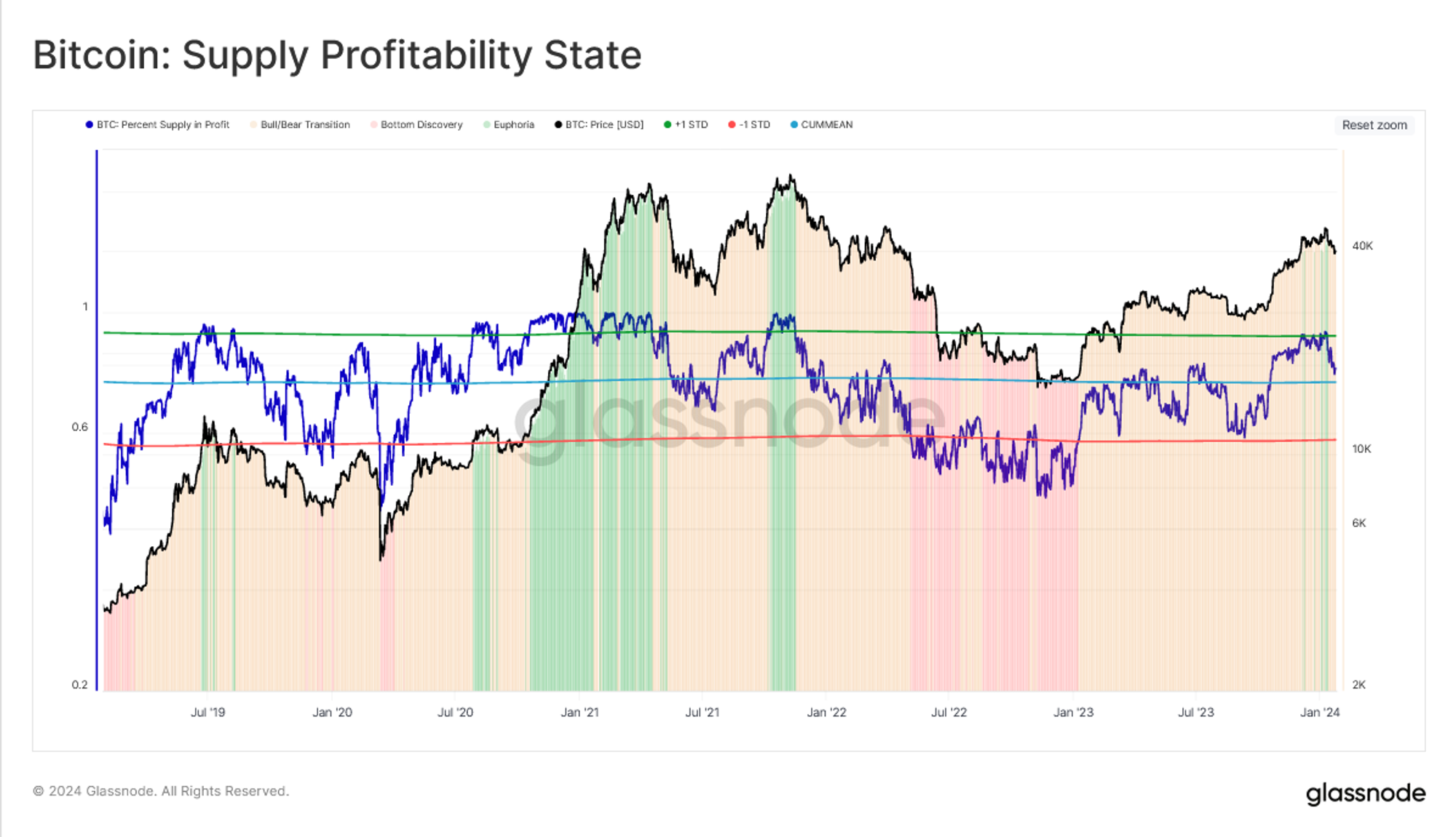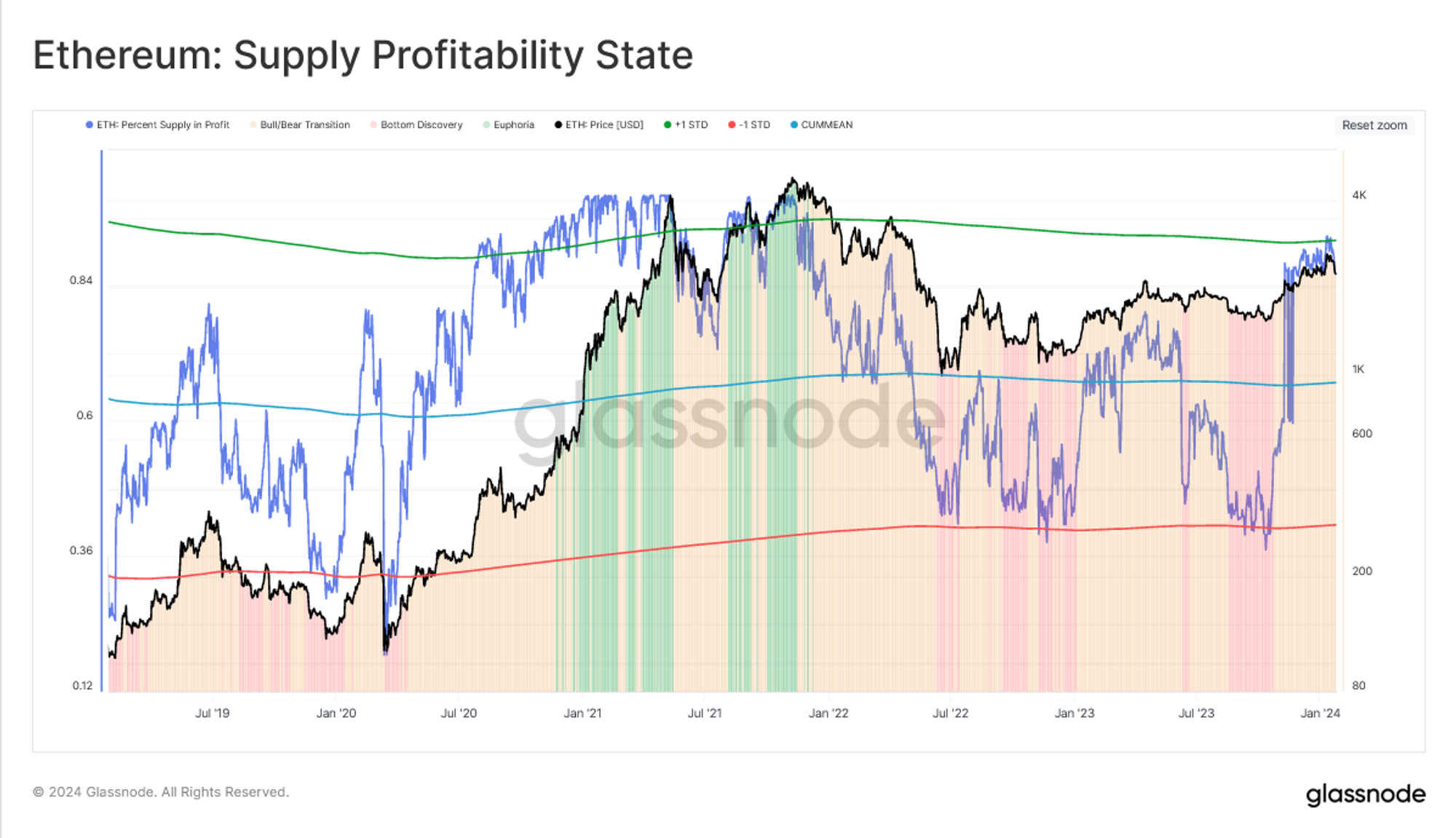 The percentage of Supply in Profit for both Bitcoin and Ethereum has reached a statistically significant, high level, indicating a phase where a notable portion of the market is holding profitable positions. This scenario, commonly observed at the onset of previous bull markets, points to a possible de-risking.