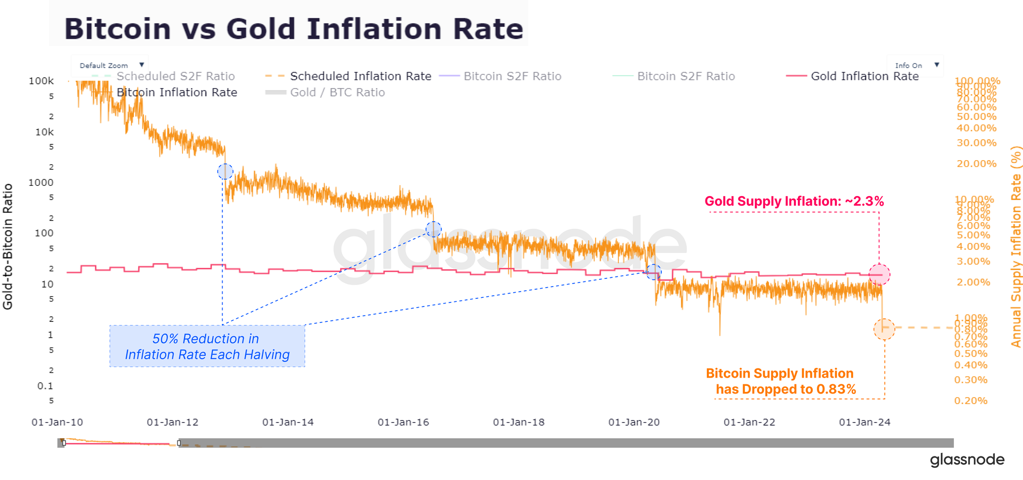 In mid-April, Bitcoin experienced its fourth halving event, reducing daily supply inflation by 50%, dropping the issuance rate to 0.85% per annum. This reduction reinforced Bitcoin's hard money status and it marked the first time Bitcoin surpassed gold in terms of issuance scarcity. Read more